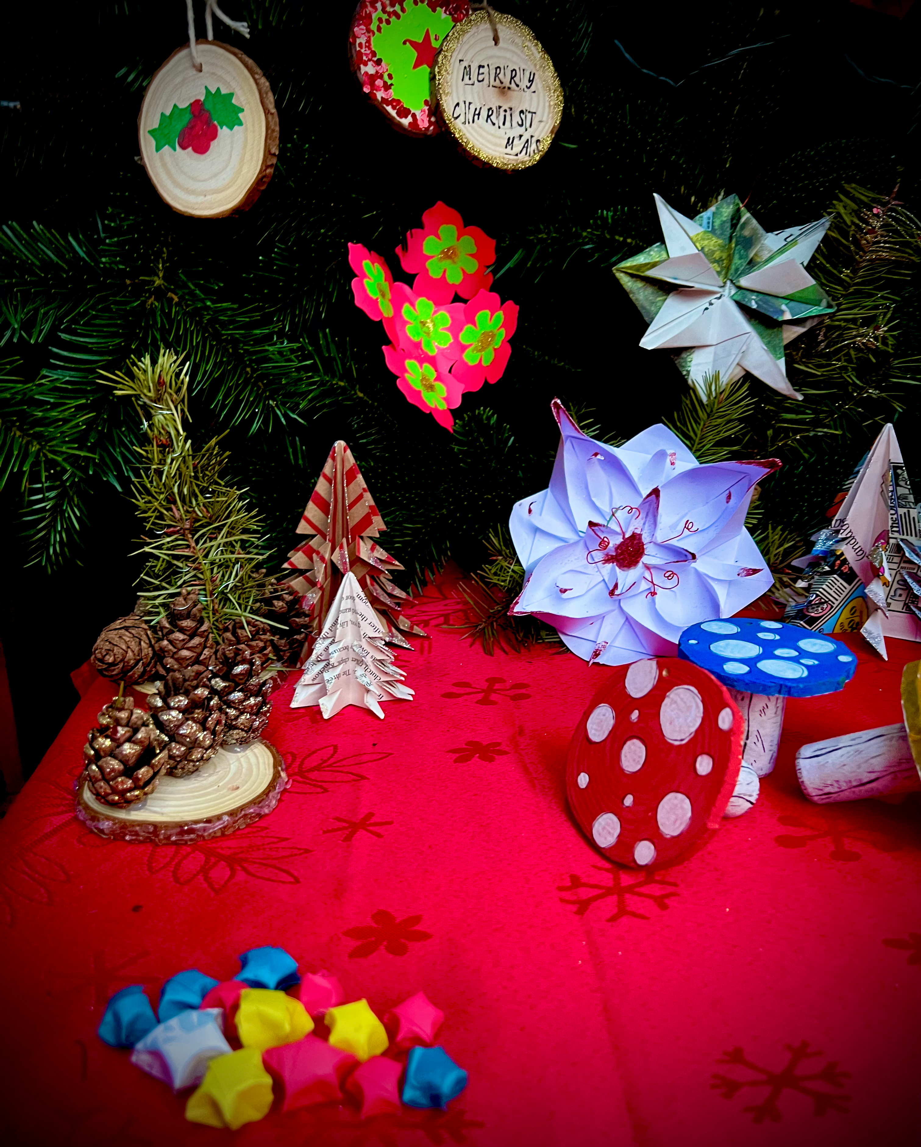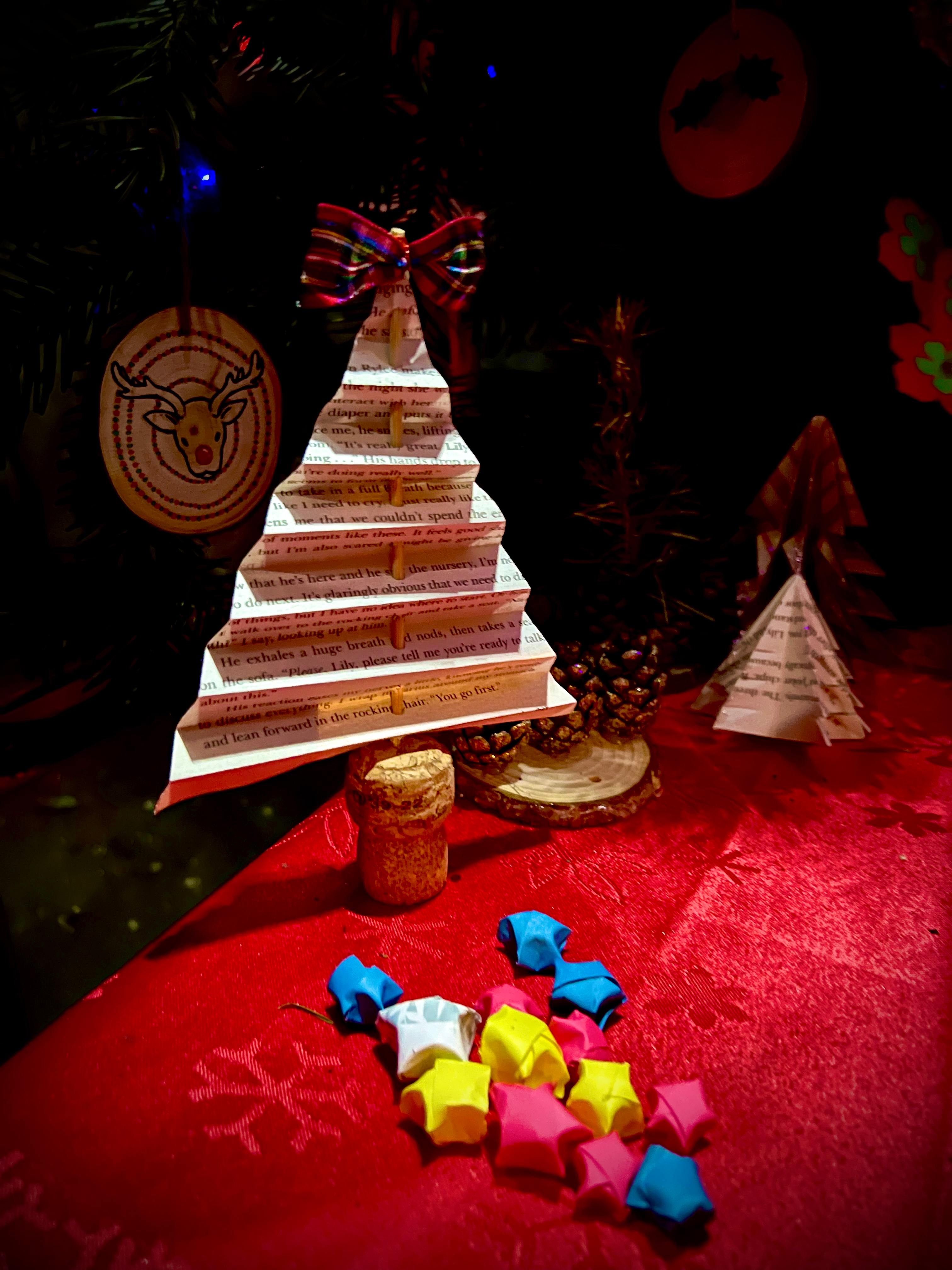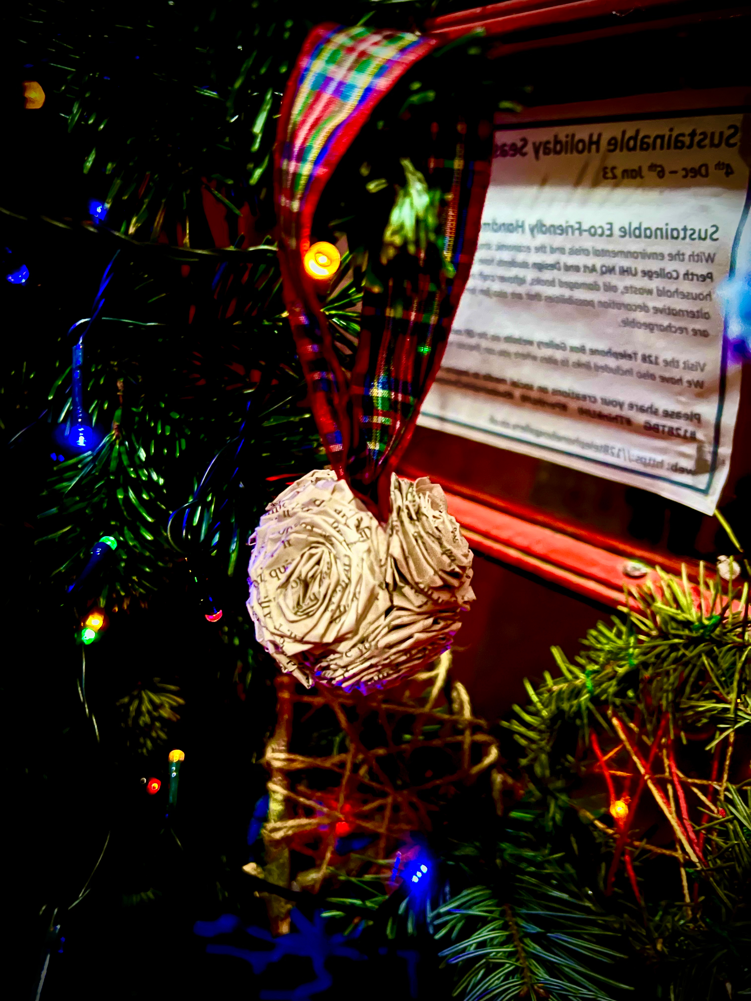 With the environmental crisis and the economic struggles that people are facing this holiday season Perth College UHI ‘NQ Art and Design‘ students have created wonderful decorations from household waste, old damaged books, leftover craft materials, old fabrics and biodegradable glitter to demonstrate cost-effective and fun to make alternative decoration solutions. Even the batteries used for the lights are rechargeable.