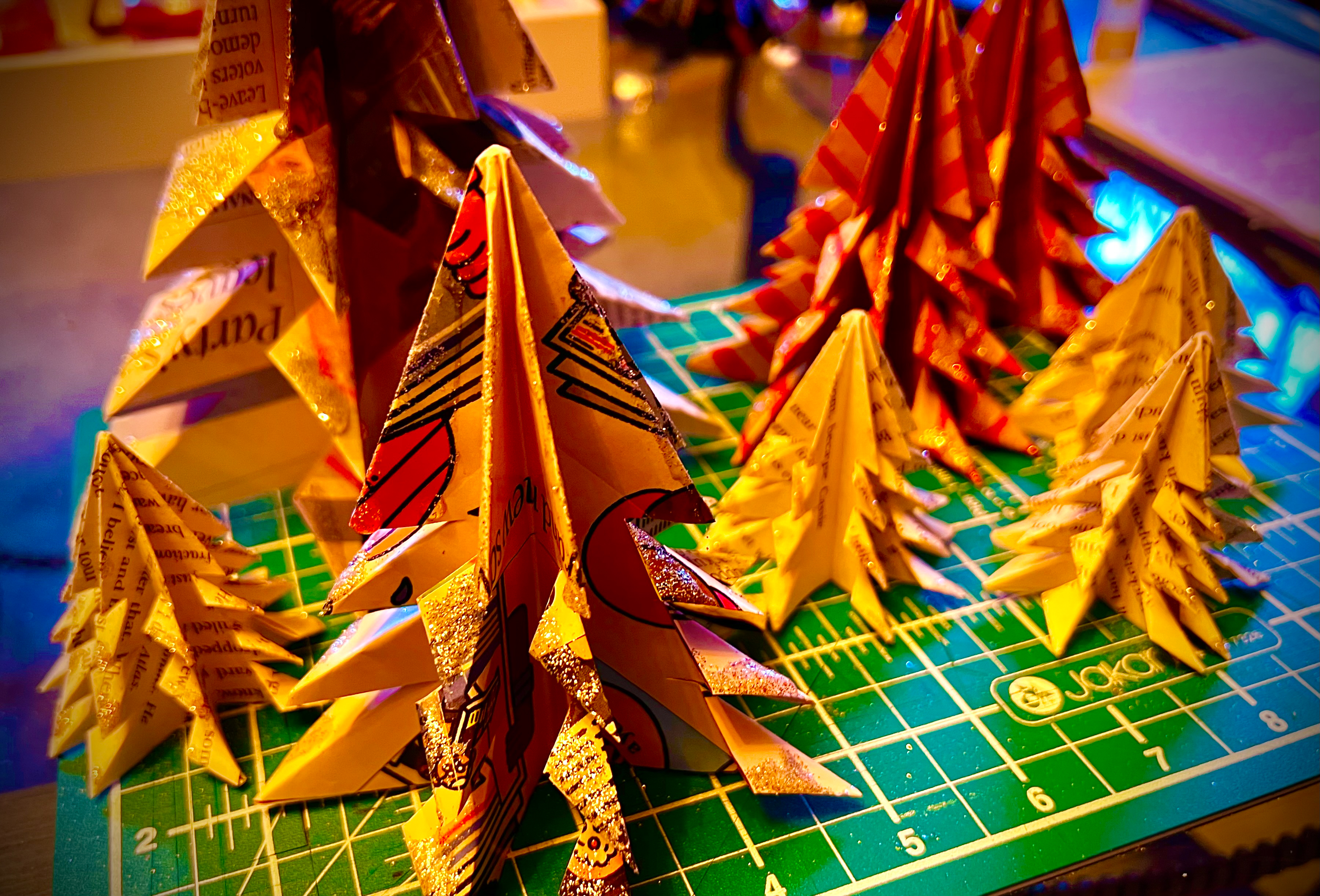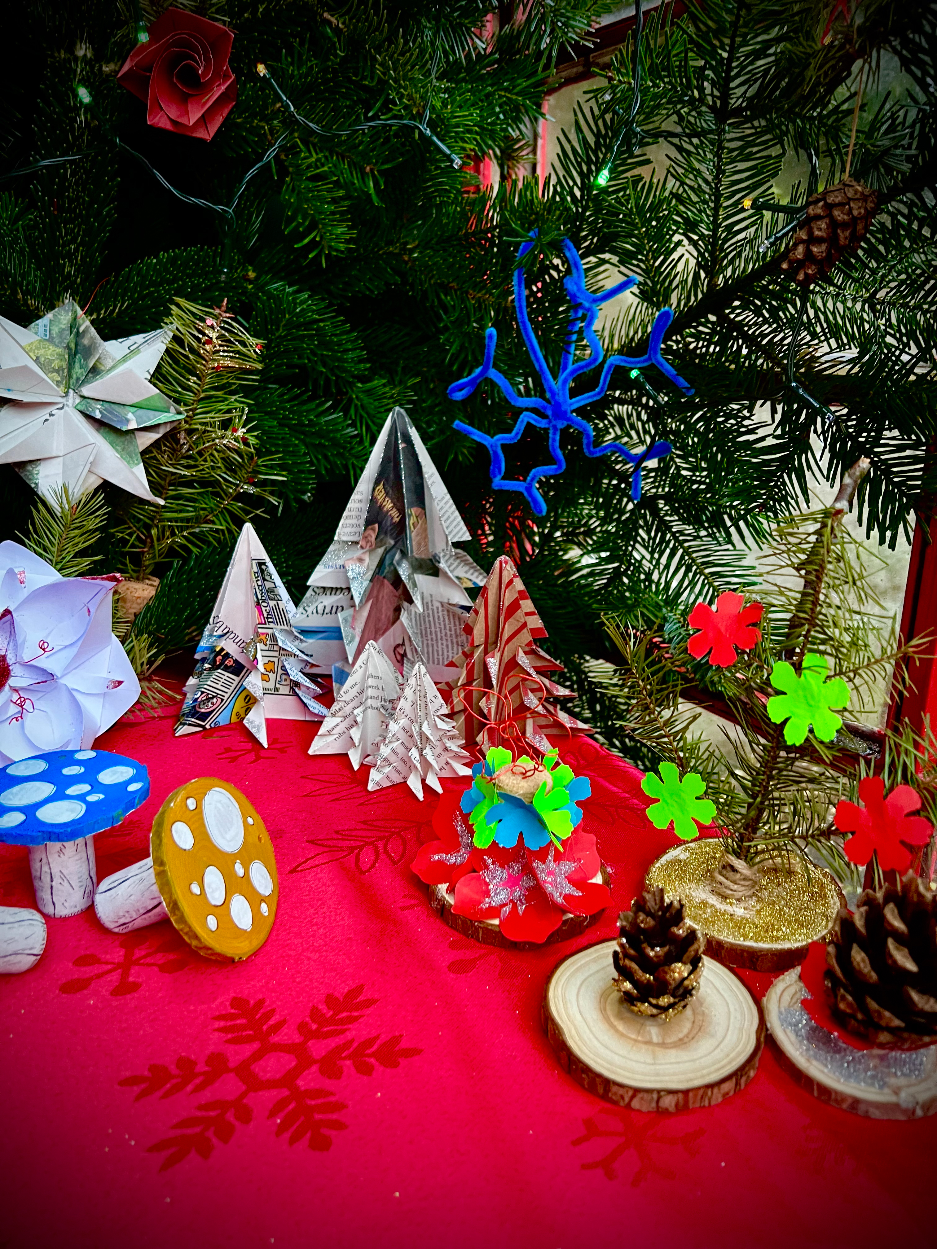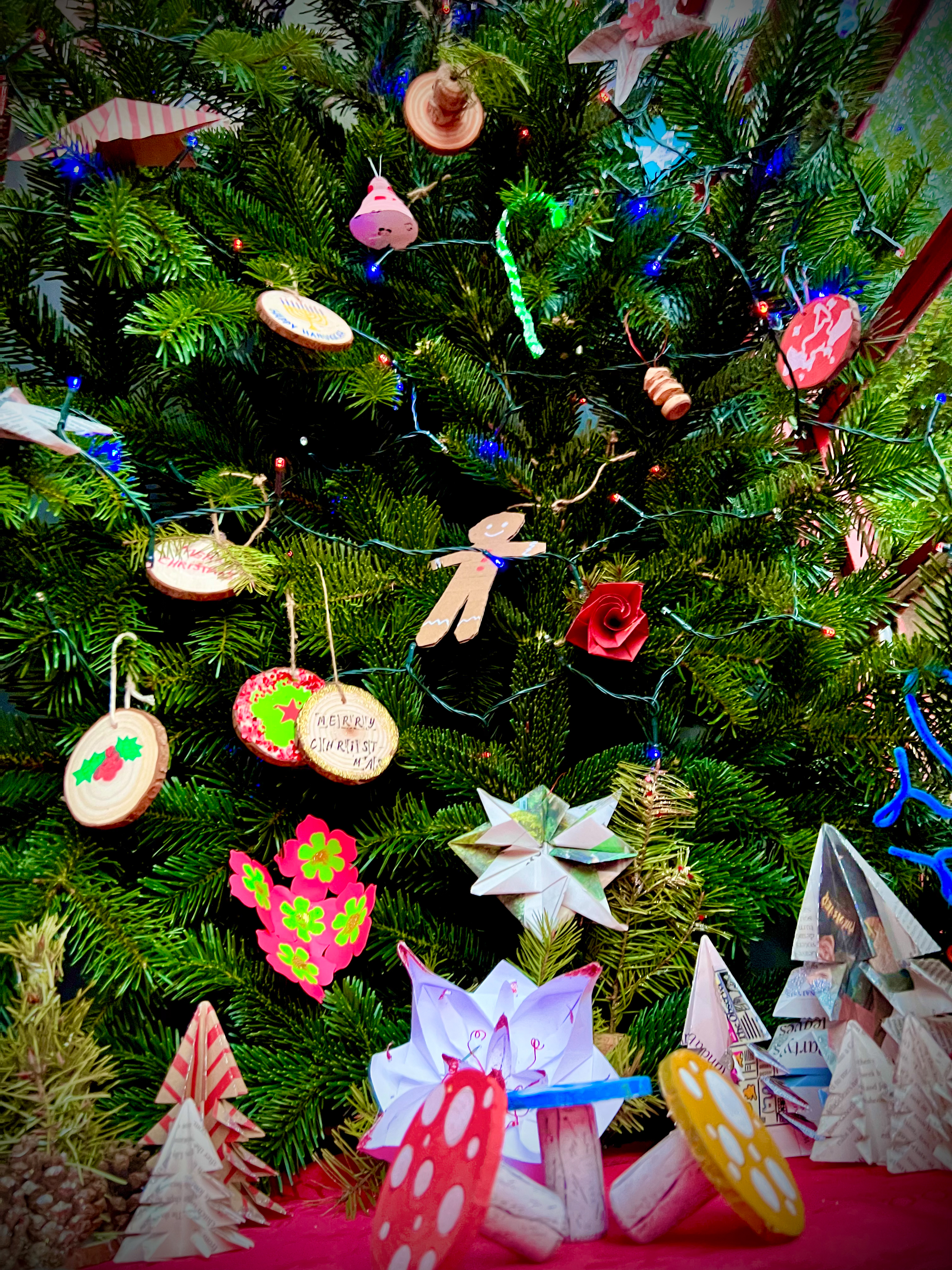 With the environmental crisis and the economic struggles that people are facing this holiday season Perth College UHI ‘NQ Art and Design‘ students have created wonderful decorations from household waste, old damaged books, leftover craft materials, old fabrics and biodegradable glitter to demonstrate cost-effective and fun to make alternative decoration solutions. Even the batteries used for the lights are rechargeable.