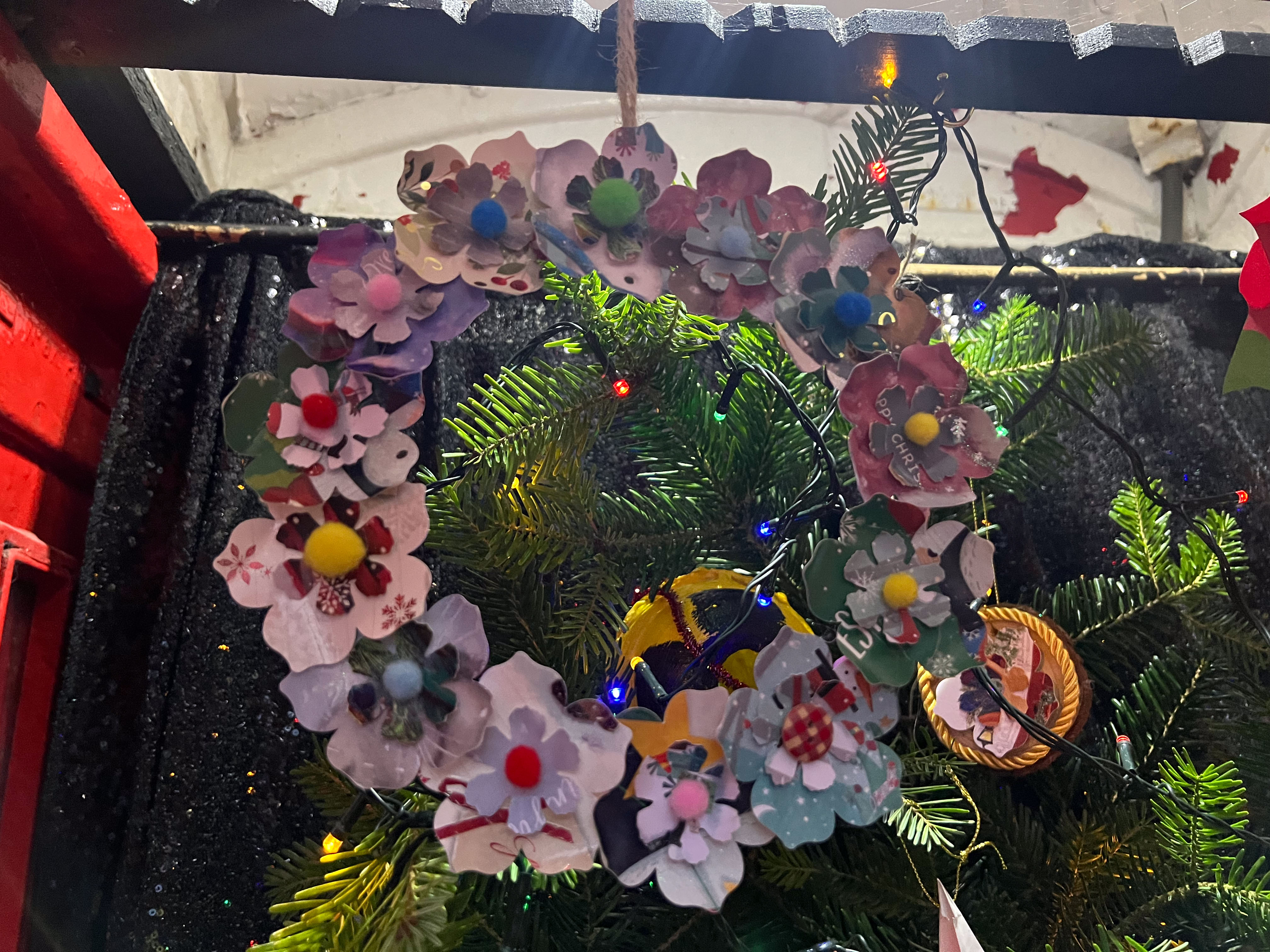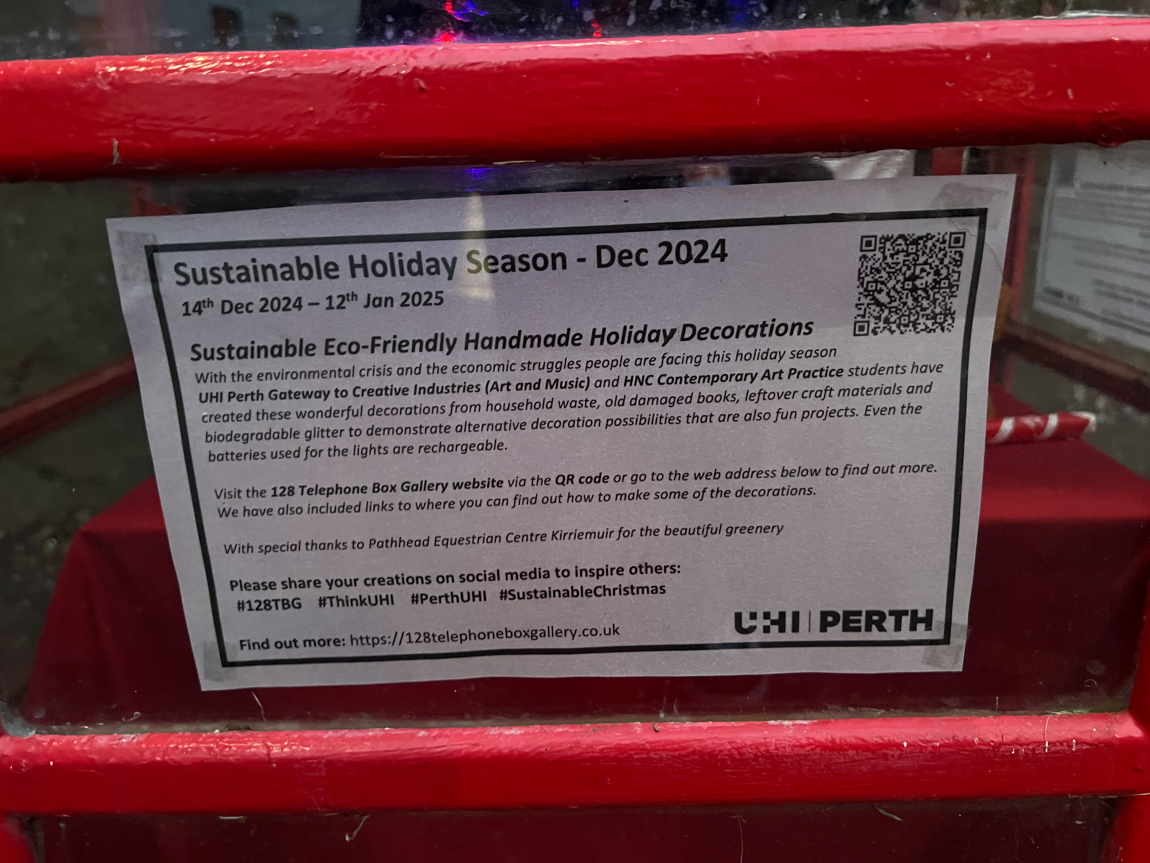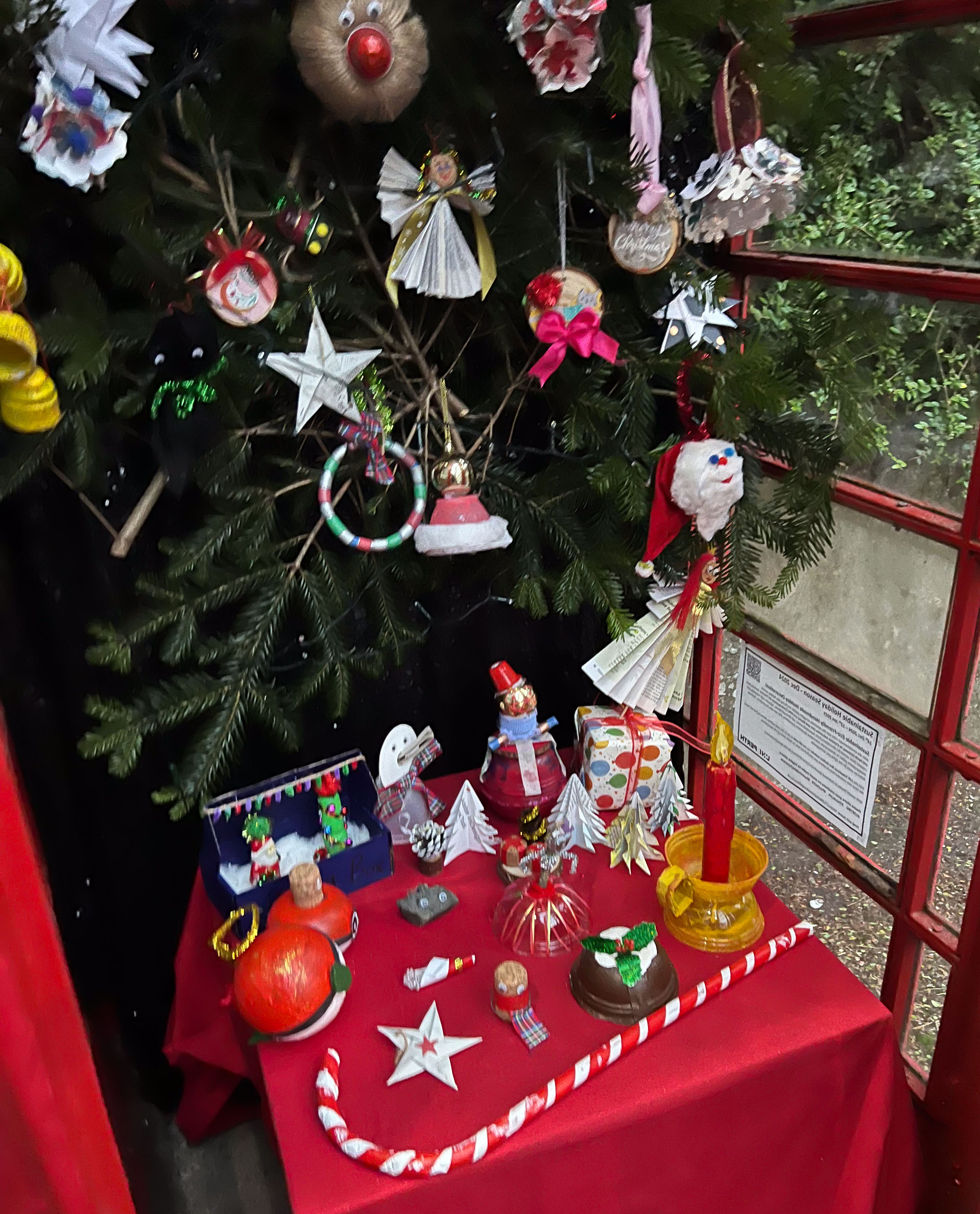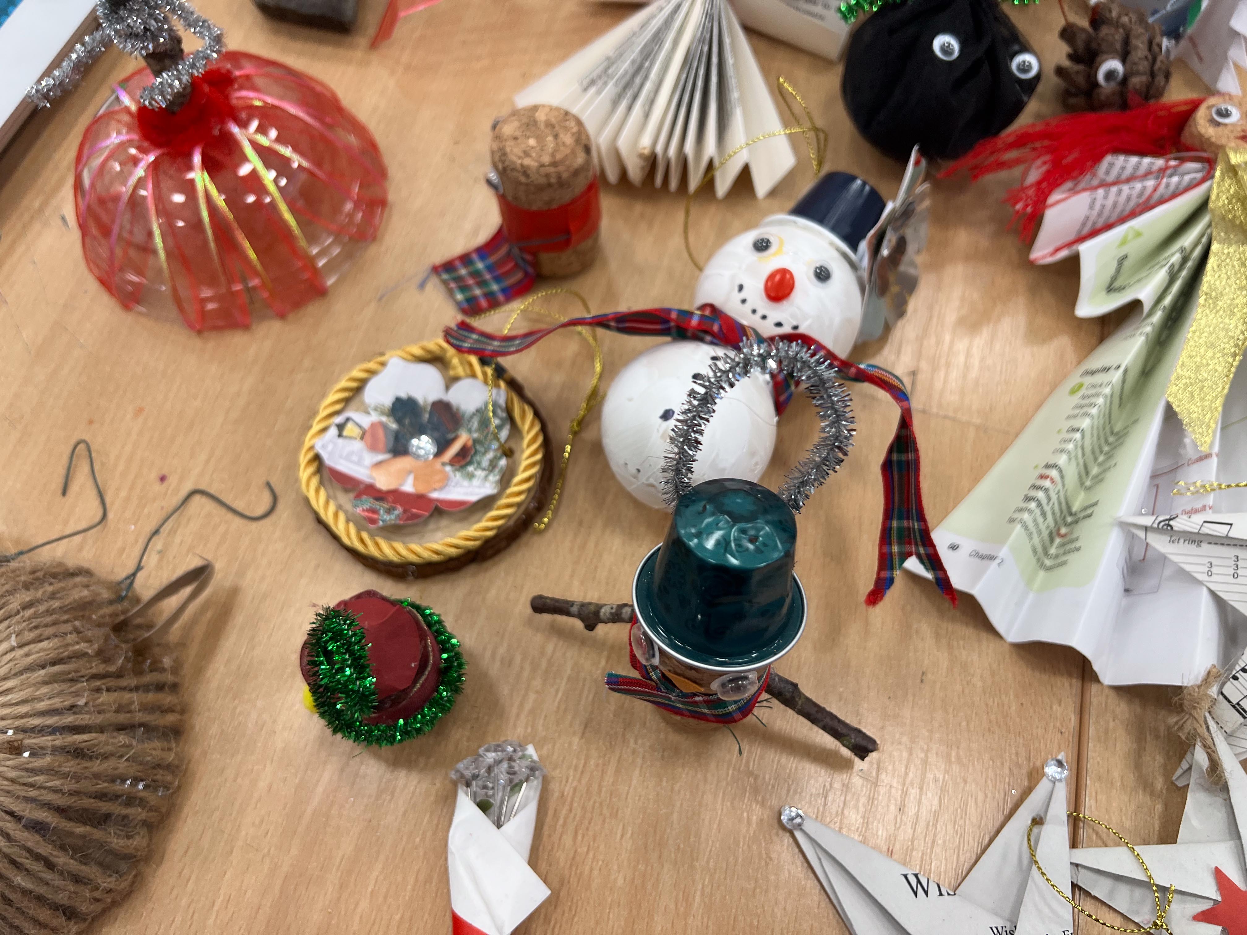 With the environmental crisis and the economic struggles that people are facing this holiday season, UHI Perth Gateway to Creative Industries (Art and Music), HNC Contemporary Art Practice students and members of the Culture Club art club have created wonderful holiday decorations from household waste, old damaged books, broken decorations, leftover craft materials, old fabrics and biodegradable glitter to demonstrate cost-effective and fun to make alternative decoration solutions. Even the batteries used for the lights are rechargeable. This is to inspire people to have fun making their own.