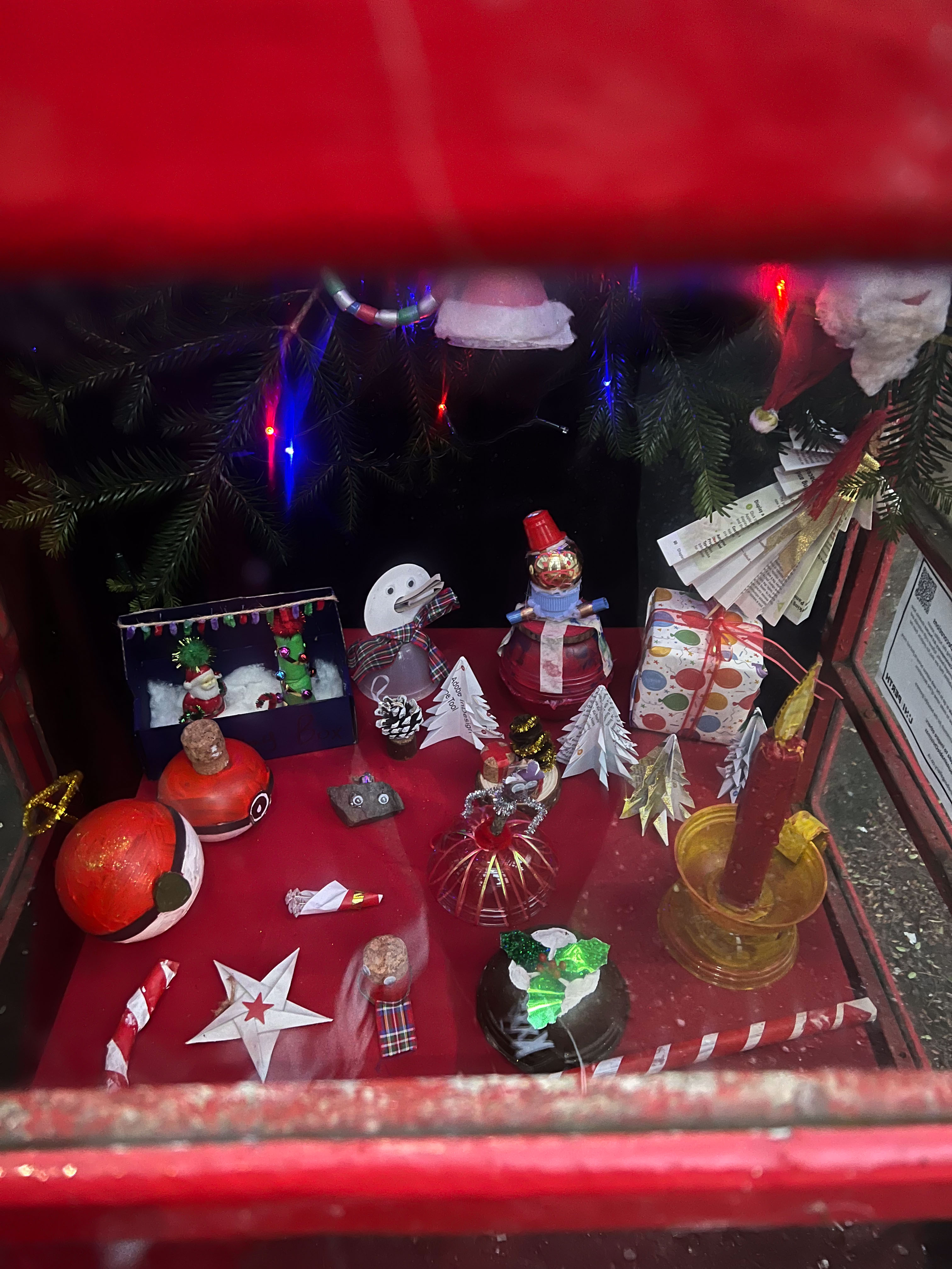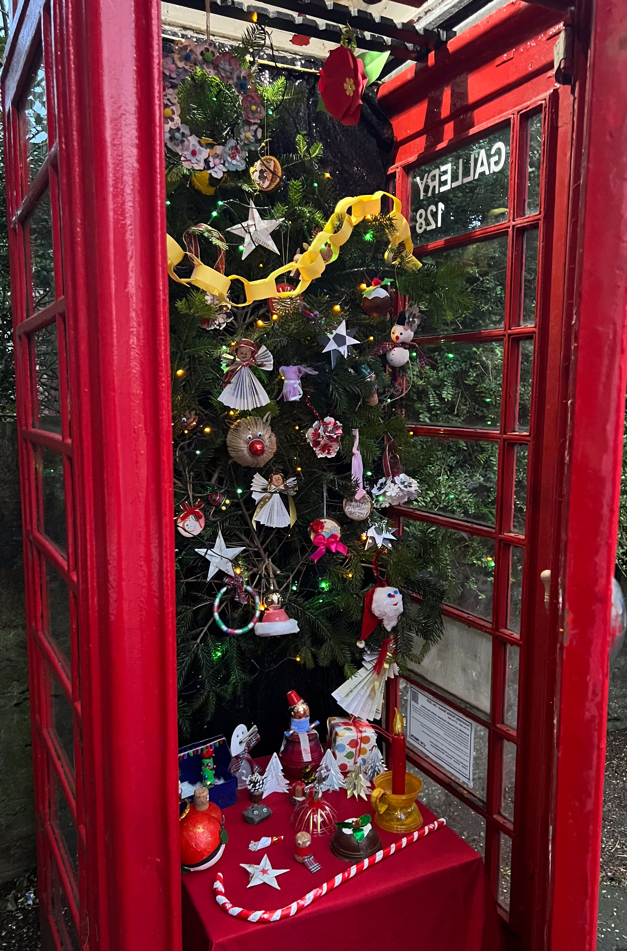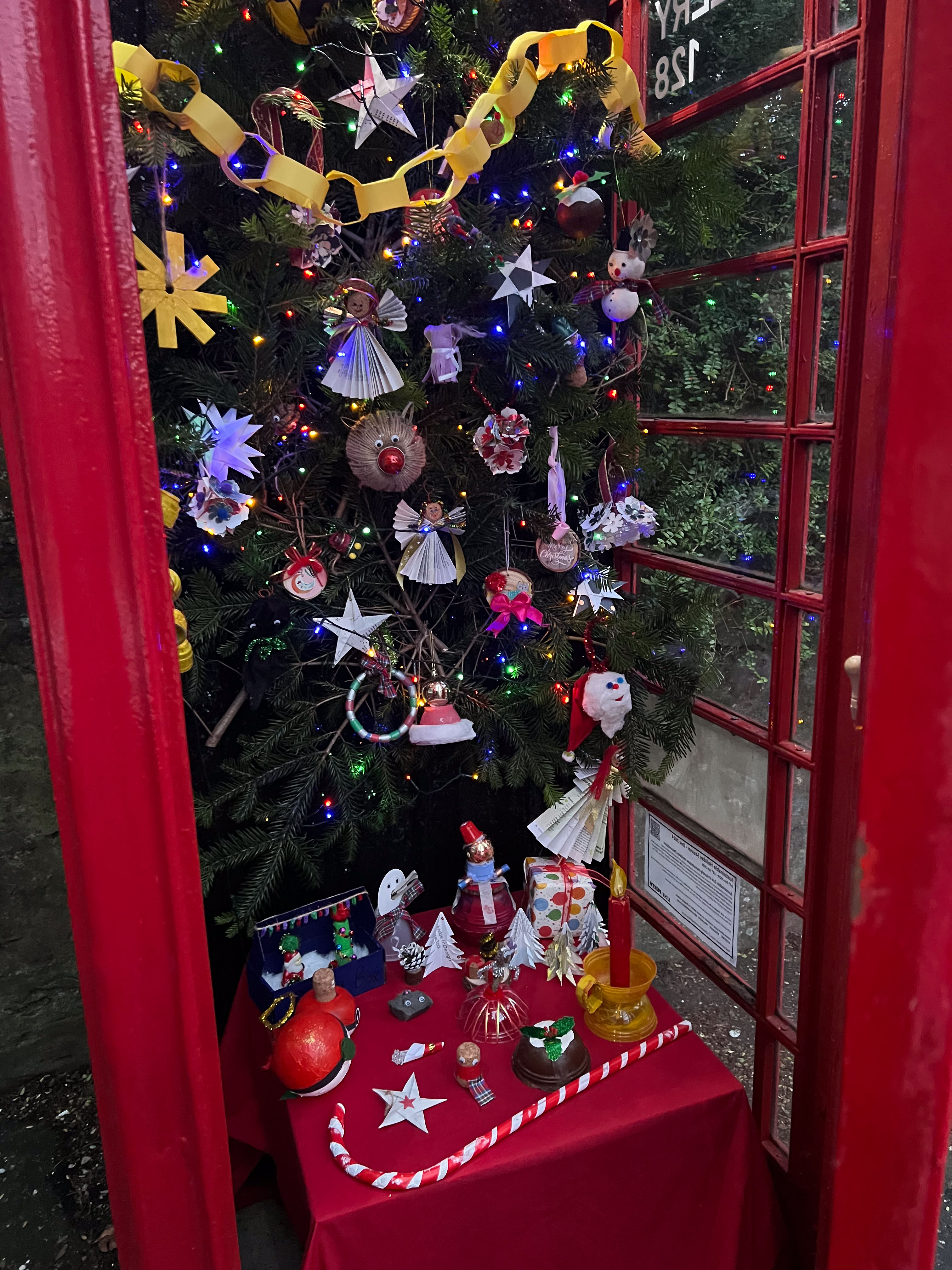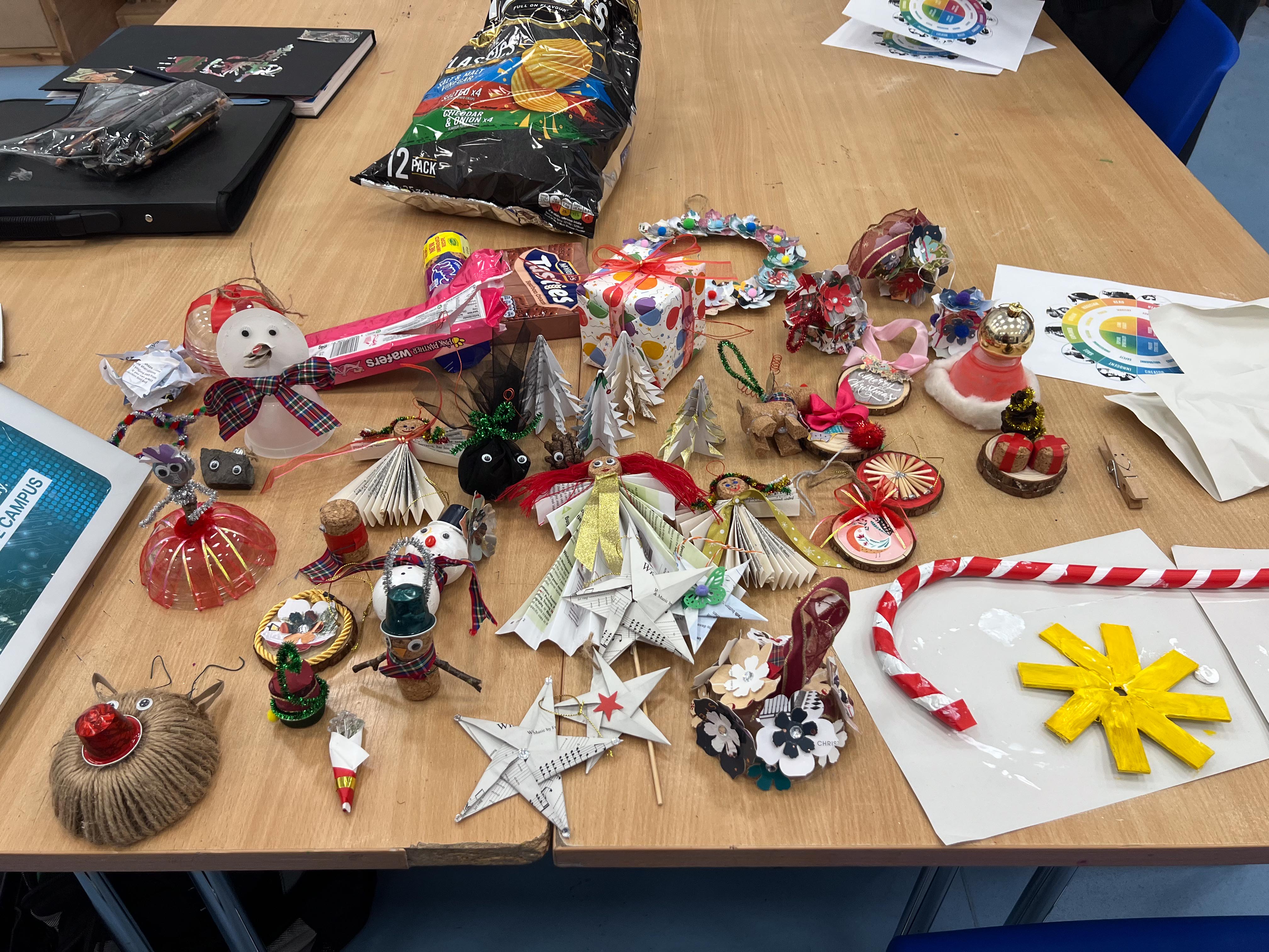 With the environmental crisis and the economic struggles that people are facing this holiday season, UHI Perth Gateway to Creative Industries (Art and Music), HNC Contemporary Art Practice students and members of the Culture Club art club have created wonderful holiday decorations from household waste, old damaged books, broken decorations, leftover craft materials, old fabrics and biodegradable glitter to demonstrate cost-effective and fun to make alternative decoration solutions. Even the batteries used for the lights are rechargeable. This is to inspire people to have fun making their own.