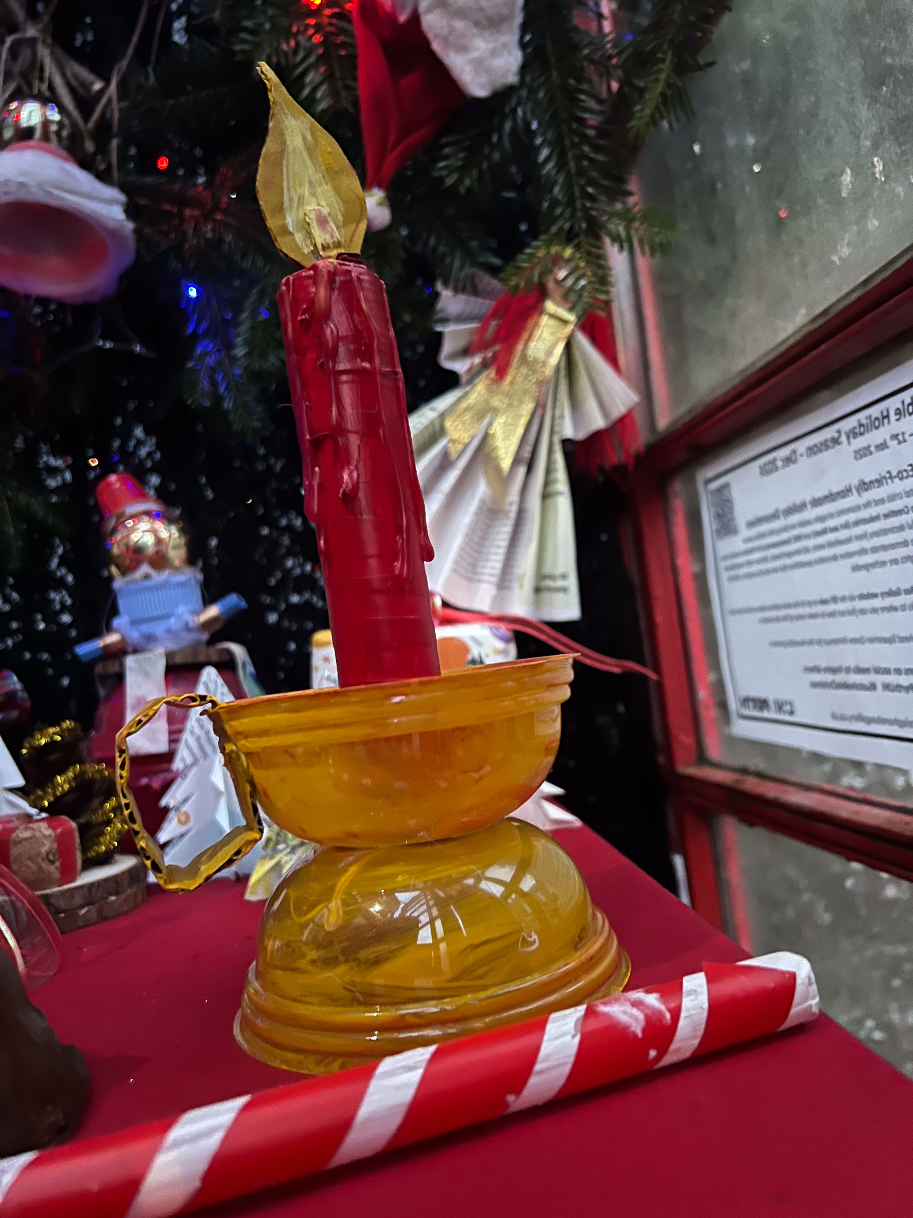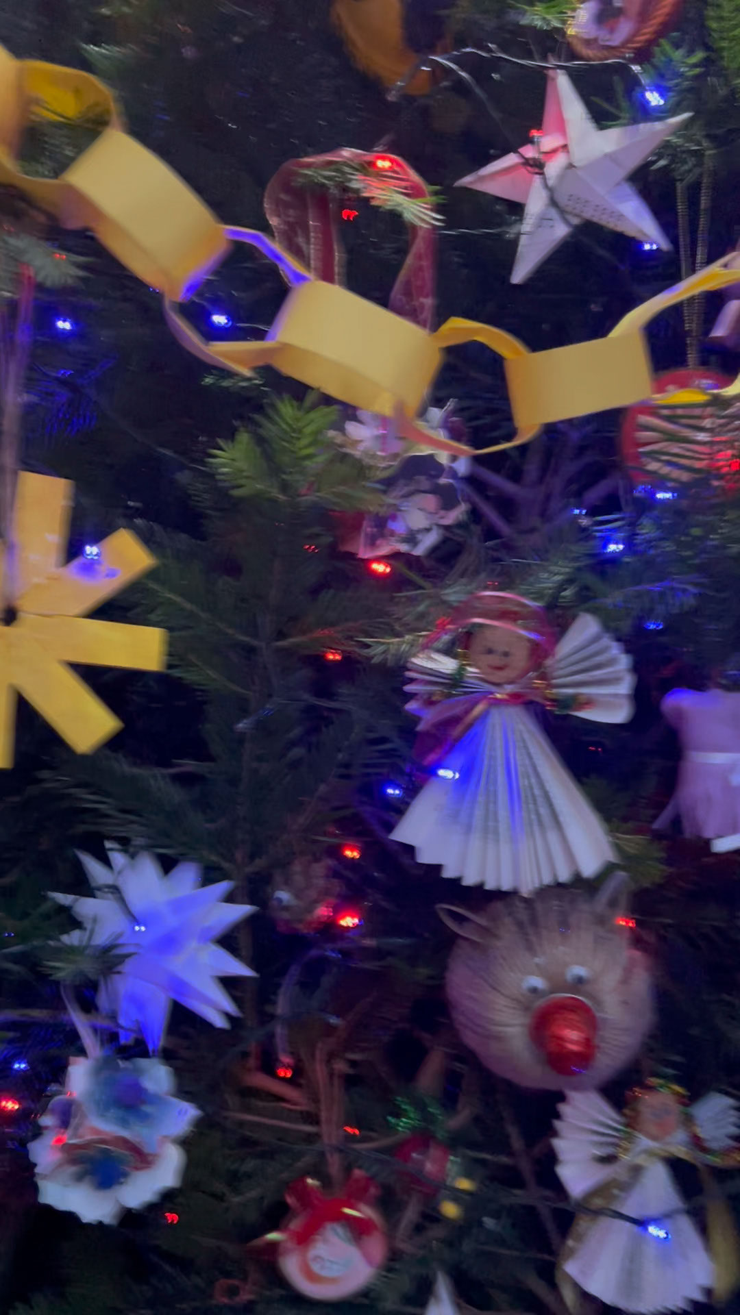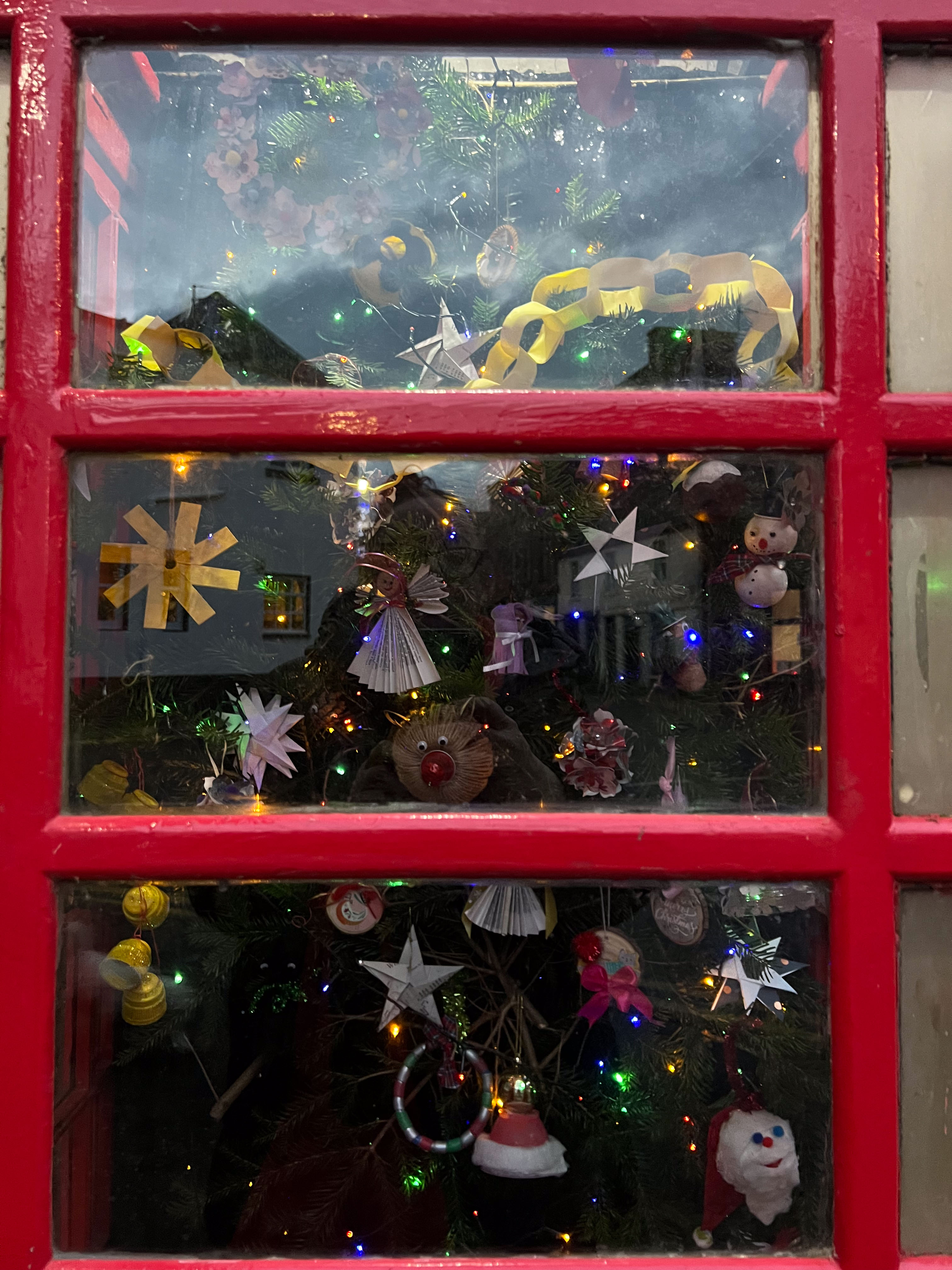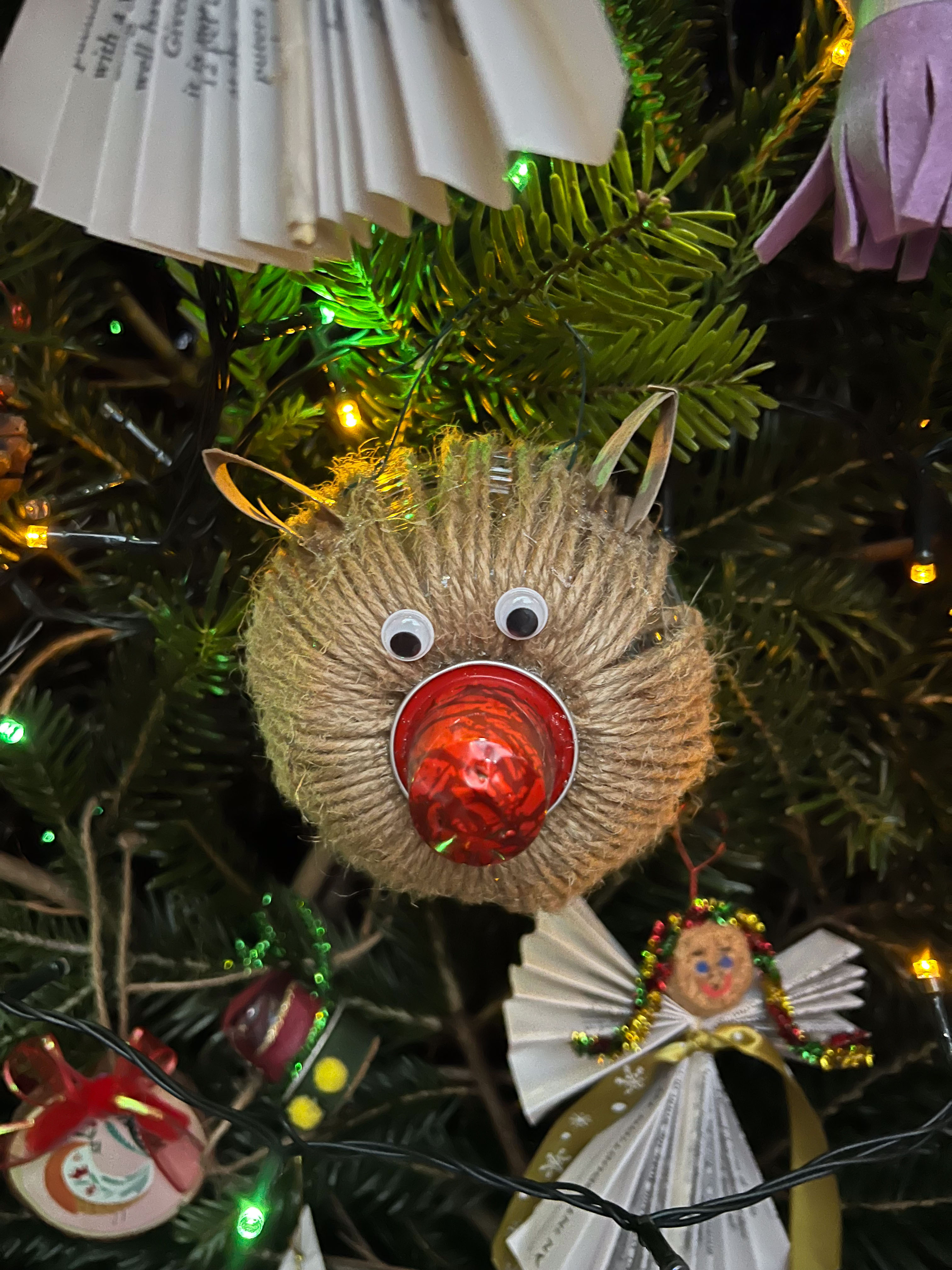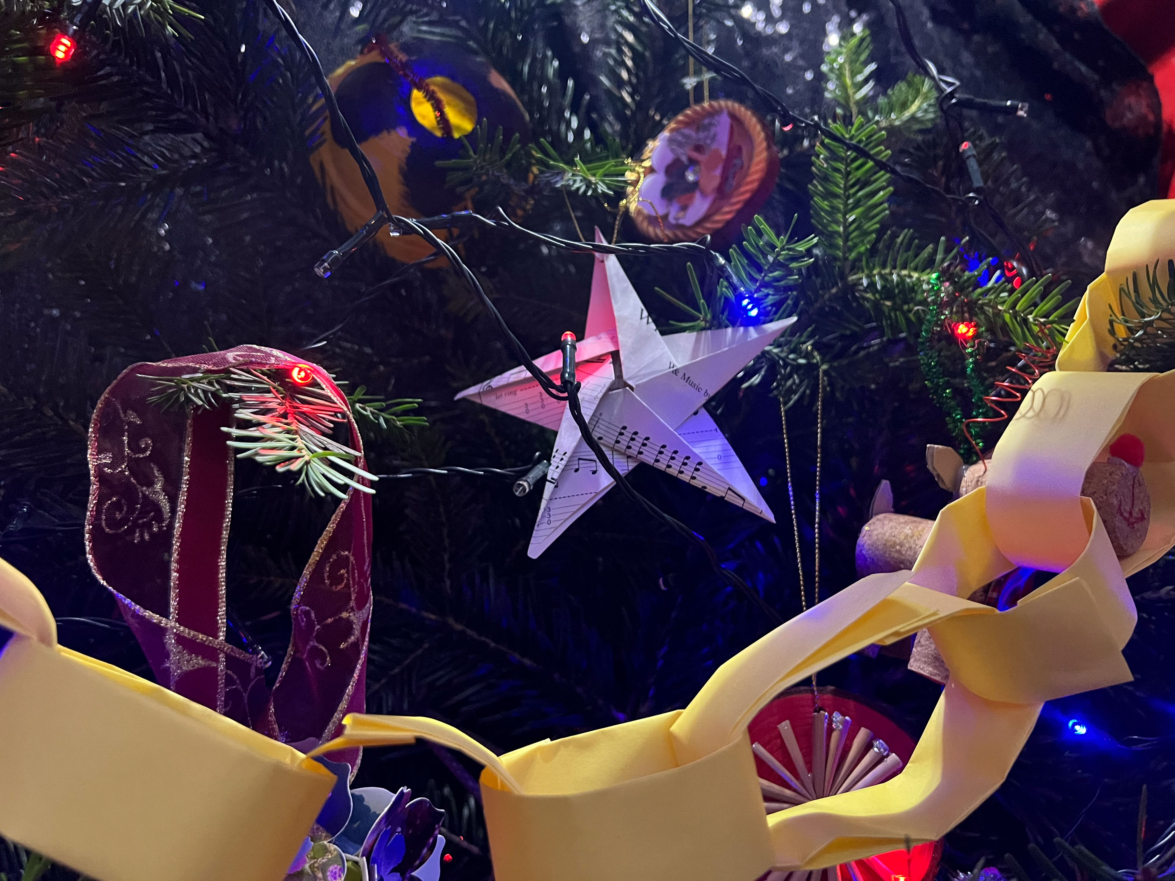 With the environmental crisis and the economic struggles that people are facing this holiday season, UHI Perth Gateway to Creative Industries (Art and Music), HNC Contemporary Art Practice students and members of the Culture Club art club have created wonderful holiday decorations from household waste, old damaged books, broken decorations, leftover craft materials, old fabrics and biodegradable glitter to demonstrate cost-effective and fun to make alternative decoration solutions. Even the batteries used for the lights are rechargeable. This is to inspire people to have fun making their own.