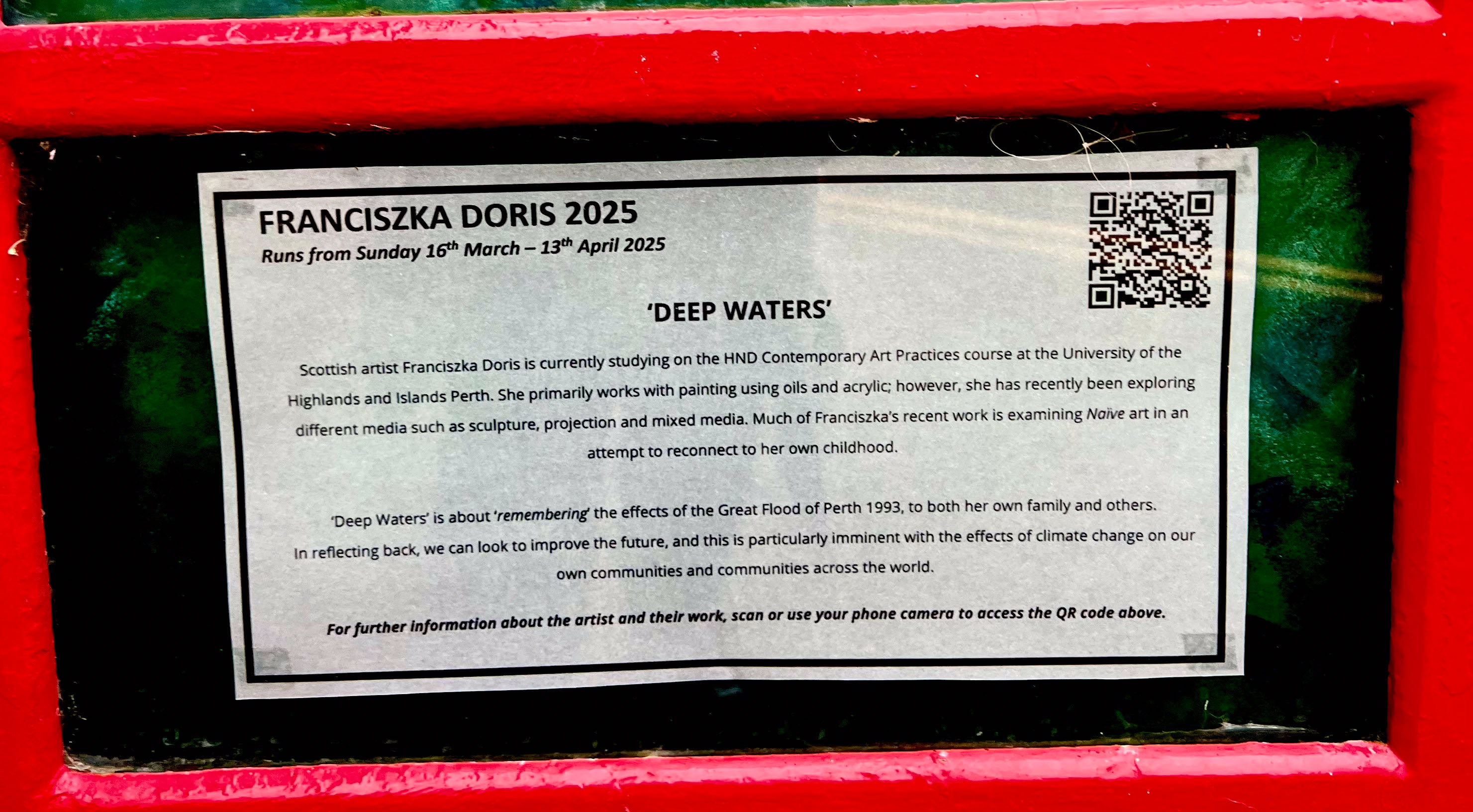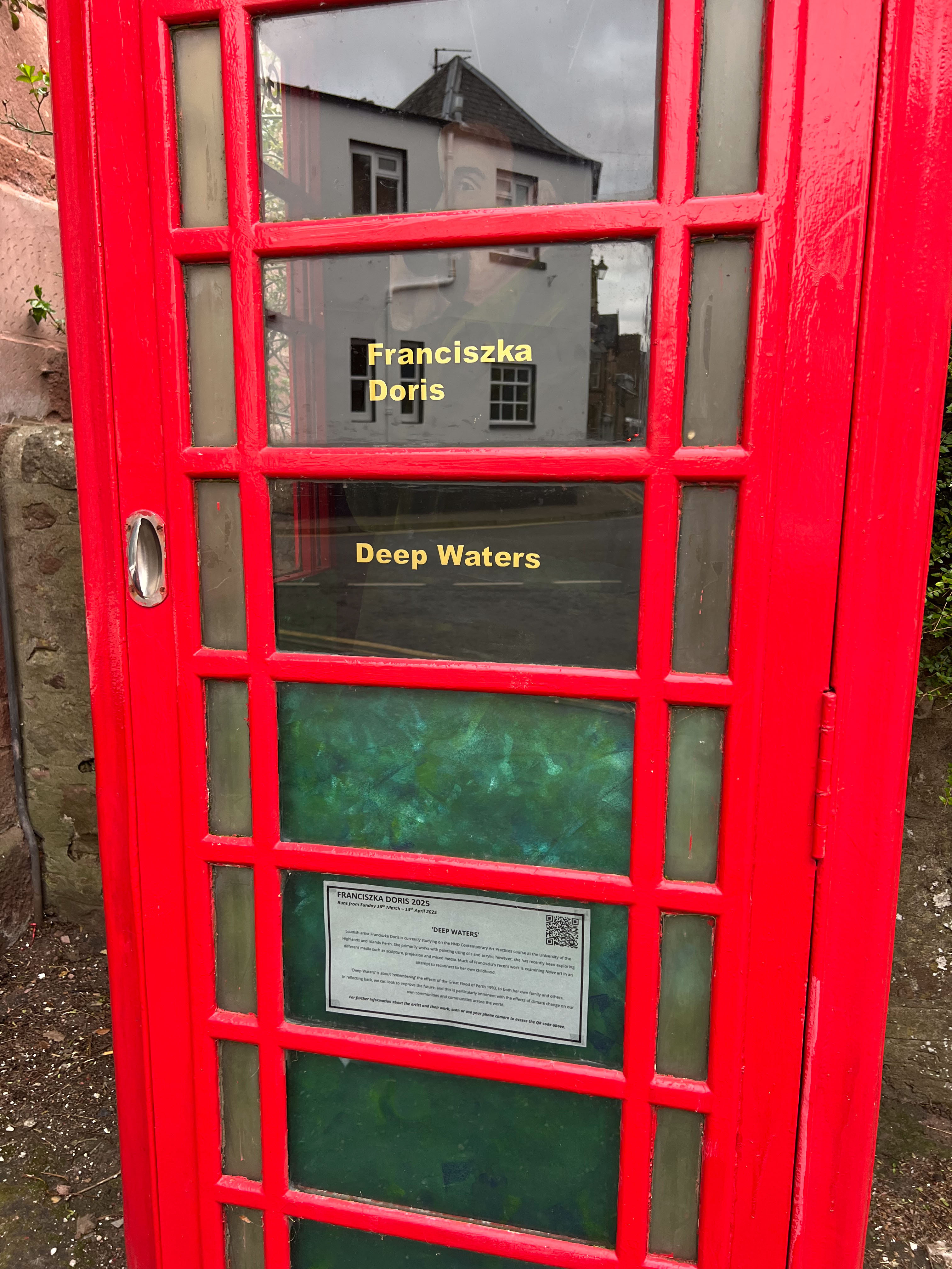 The Great Flood of 1993 is currently being exhibited at Perth Museum in King Edward Street, Perth. The exhibition: “Waters Rising”, was brought to my attention, when Perth Museum held an open day and invited Perth UHI CAP2 students to view the exhibition prior to the opening to the public. It was here, that the horrors of that flood in 1993 brought back memories of the flood and how it affected my Mum who was made homeless for up to 8 months. This exhibition in the Phonebox is from the project “Discovering Perth” which is the class assignment from my HND2 course. The chosen subject is from a photo found during my research, ‘Male frantically calling for help, up to his chest in flood water’. The photo is just so poignant and ironic, that there are no words that can emphasize the immensity or urgency more clearly.