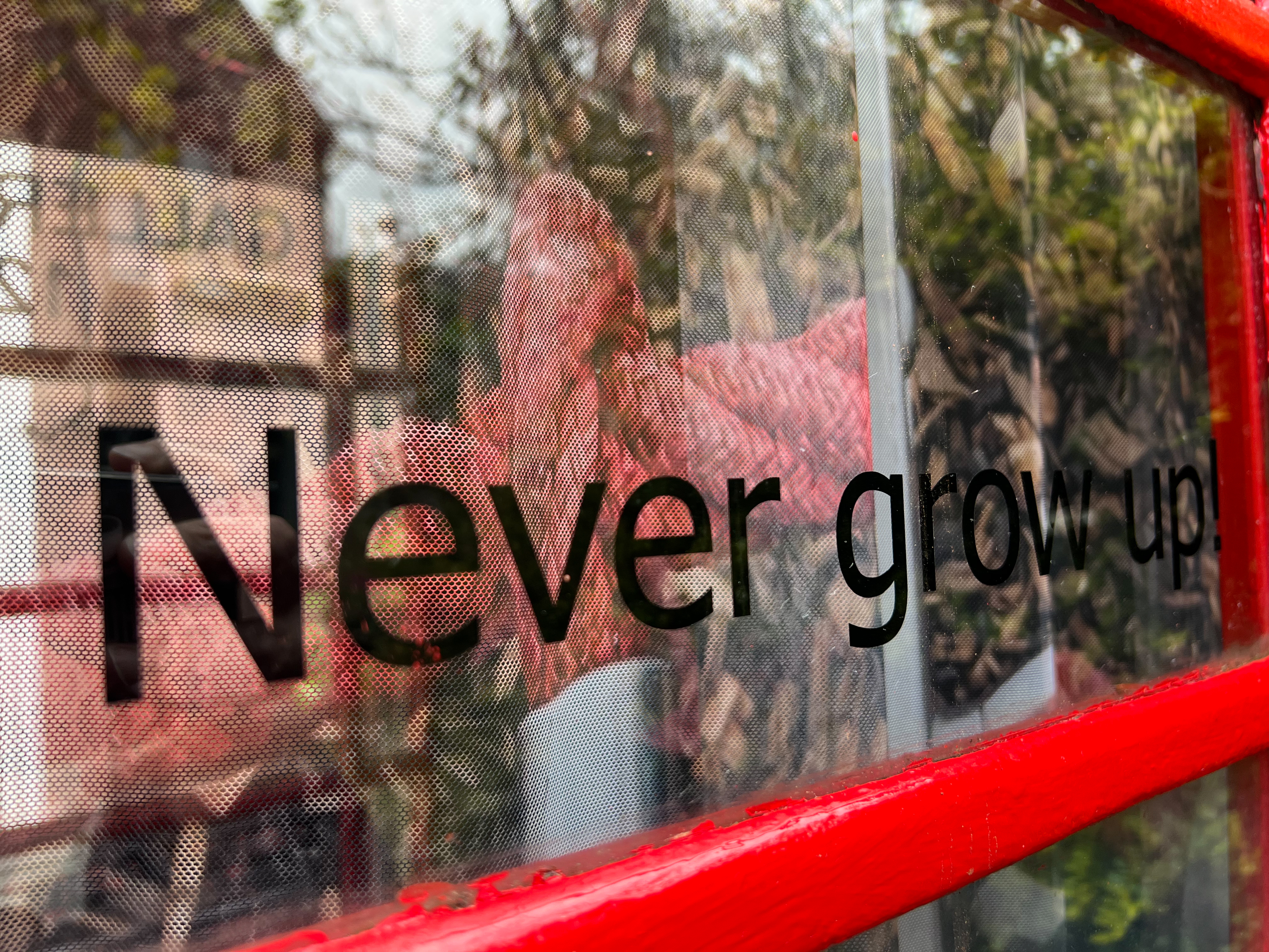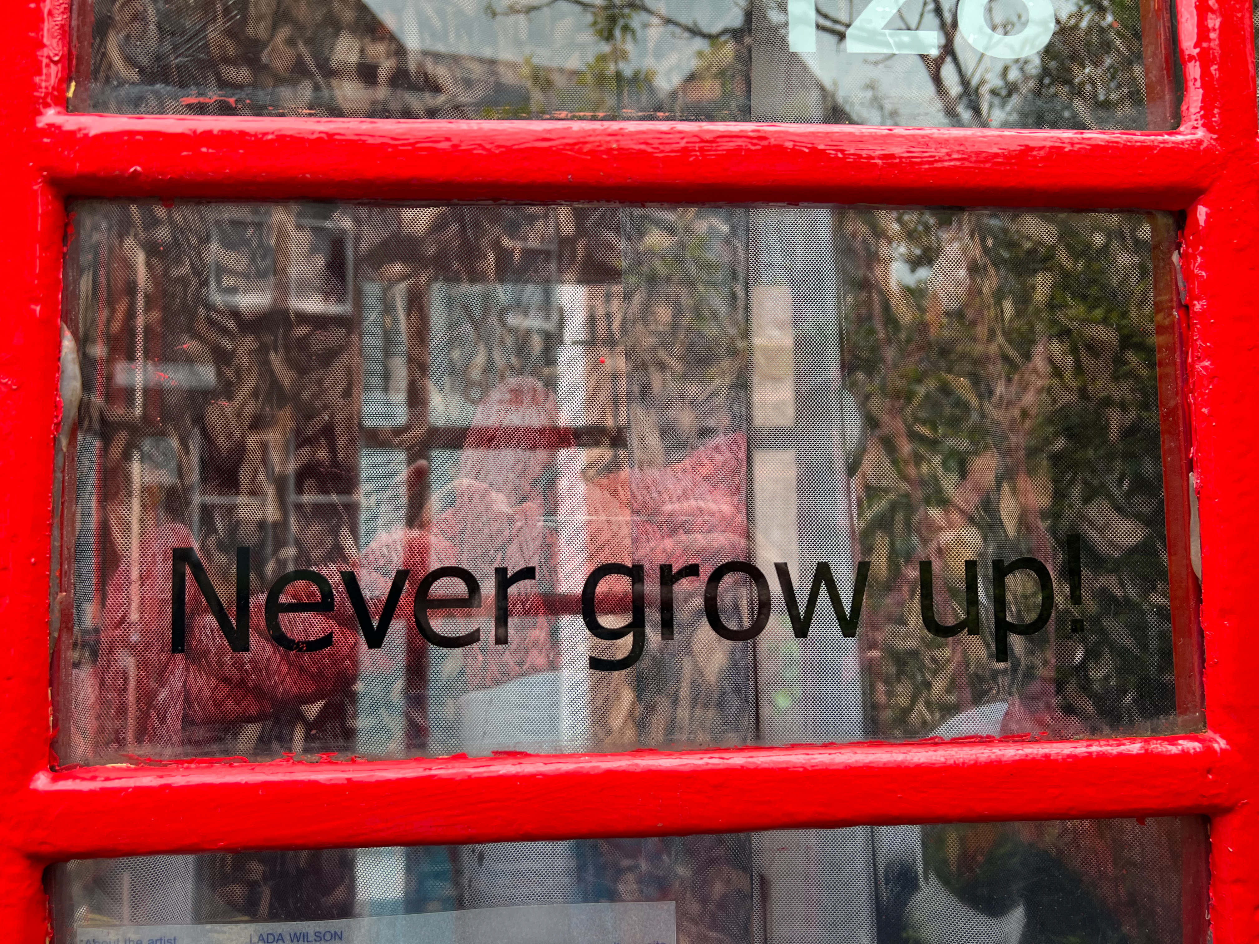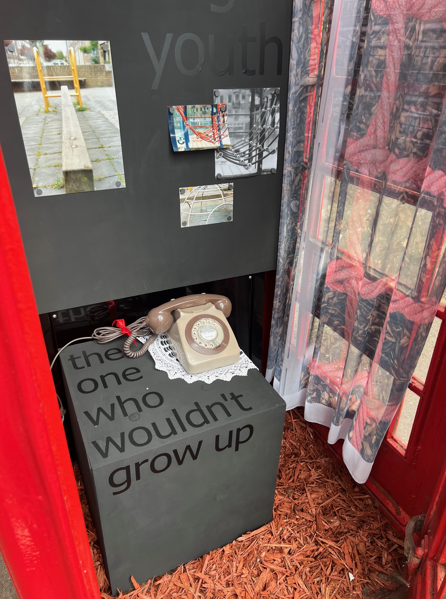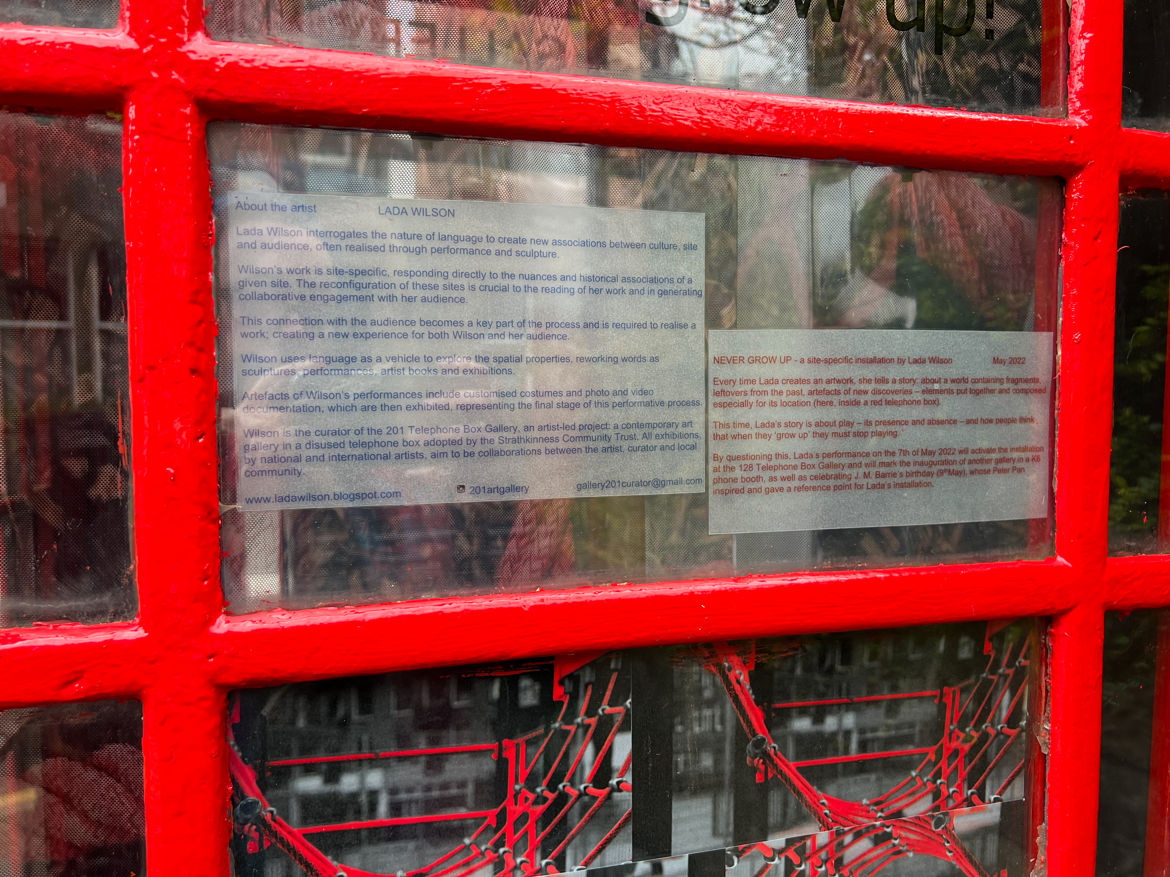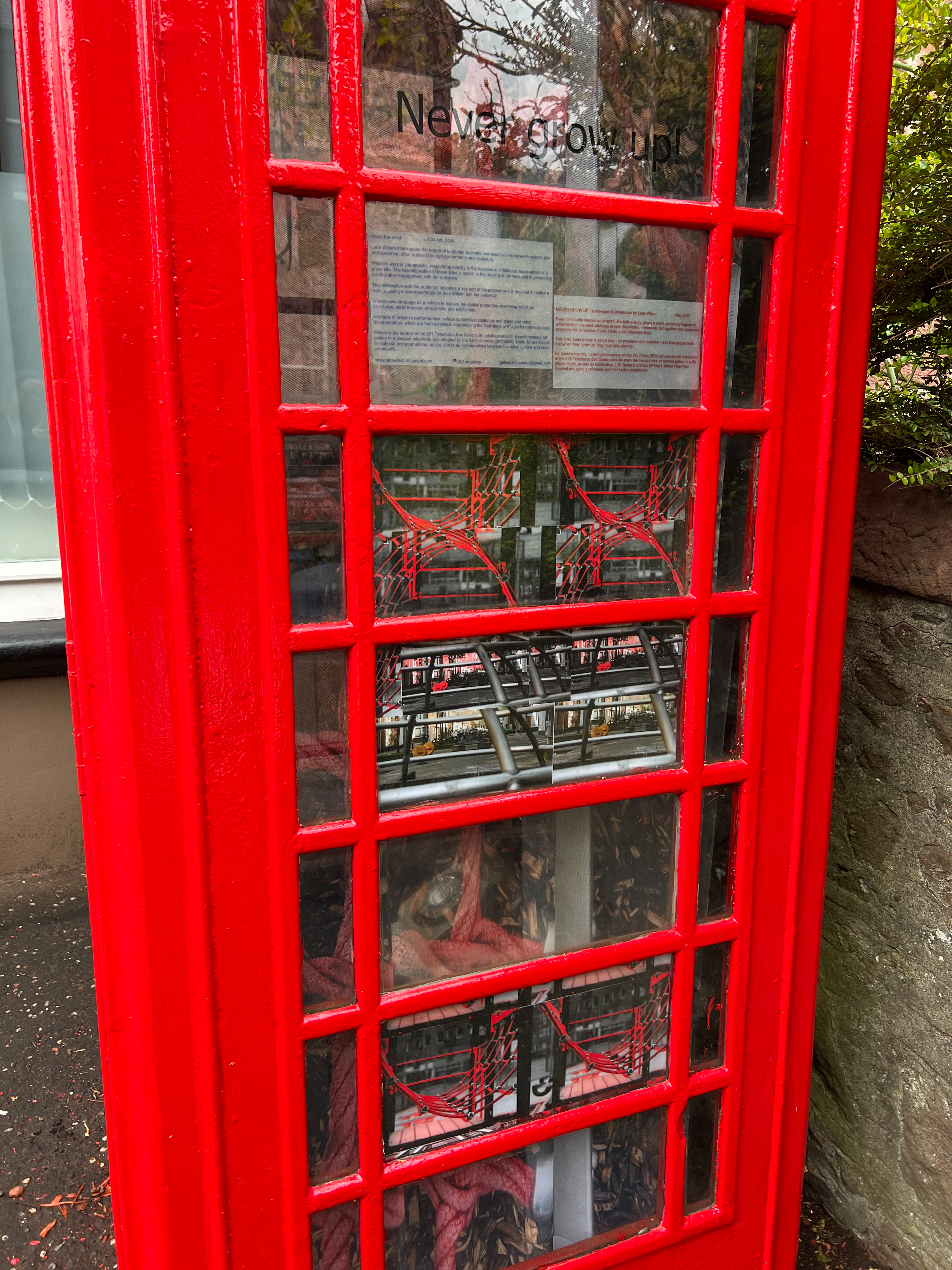By questioning this, Wilson’s performance on the 7th of May 2022 will activate the installation at the 128 Telephone Box Gallery and will mark the inauguration of another gallery in a K6 phone booth, as well as celebrating J. M. Barrie’s birthday (9thMay), whose Peter Pan inspired and gave a reference point for Wilson’s installation.
