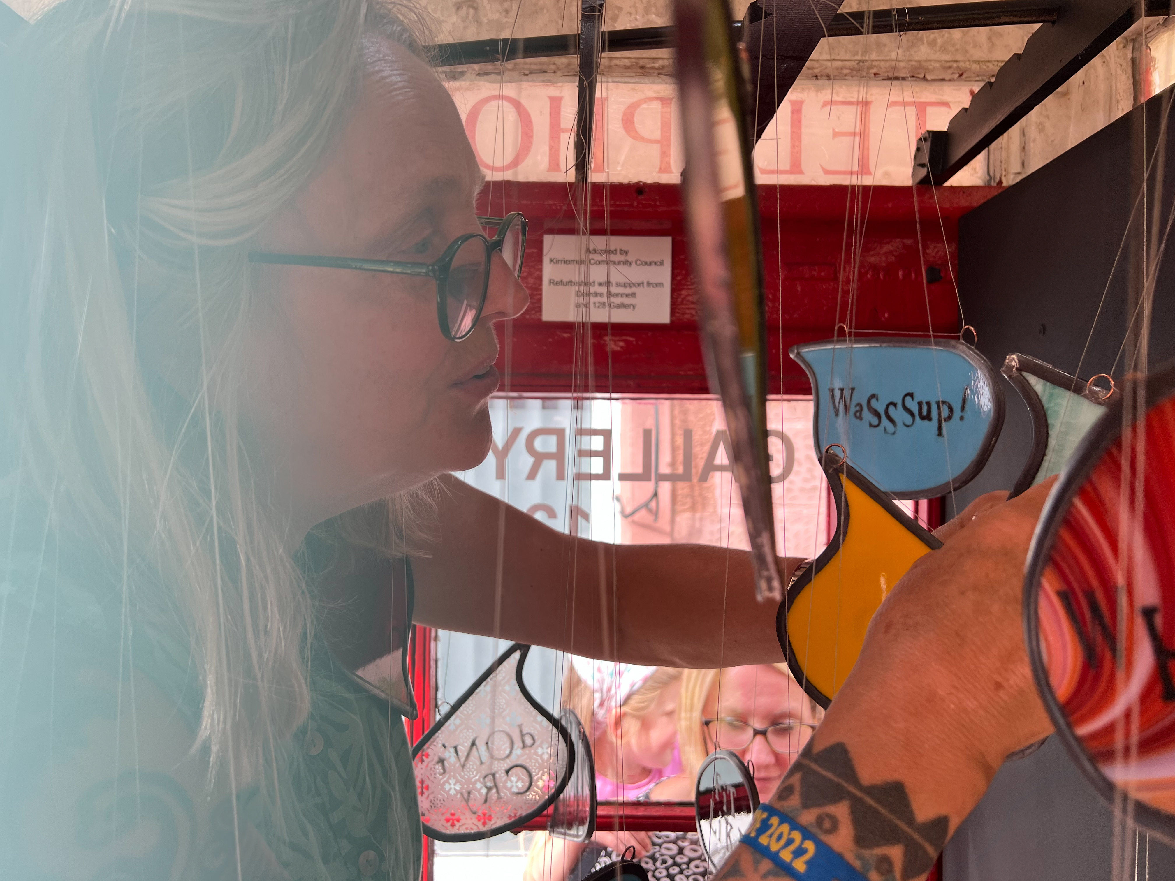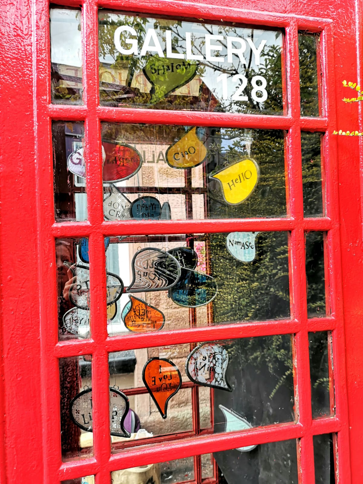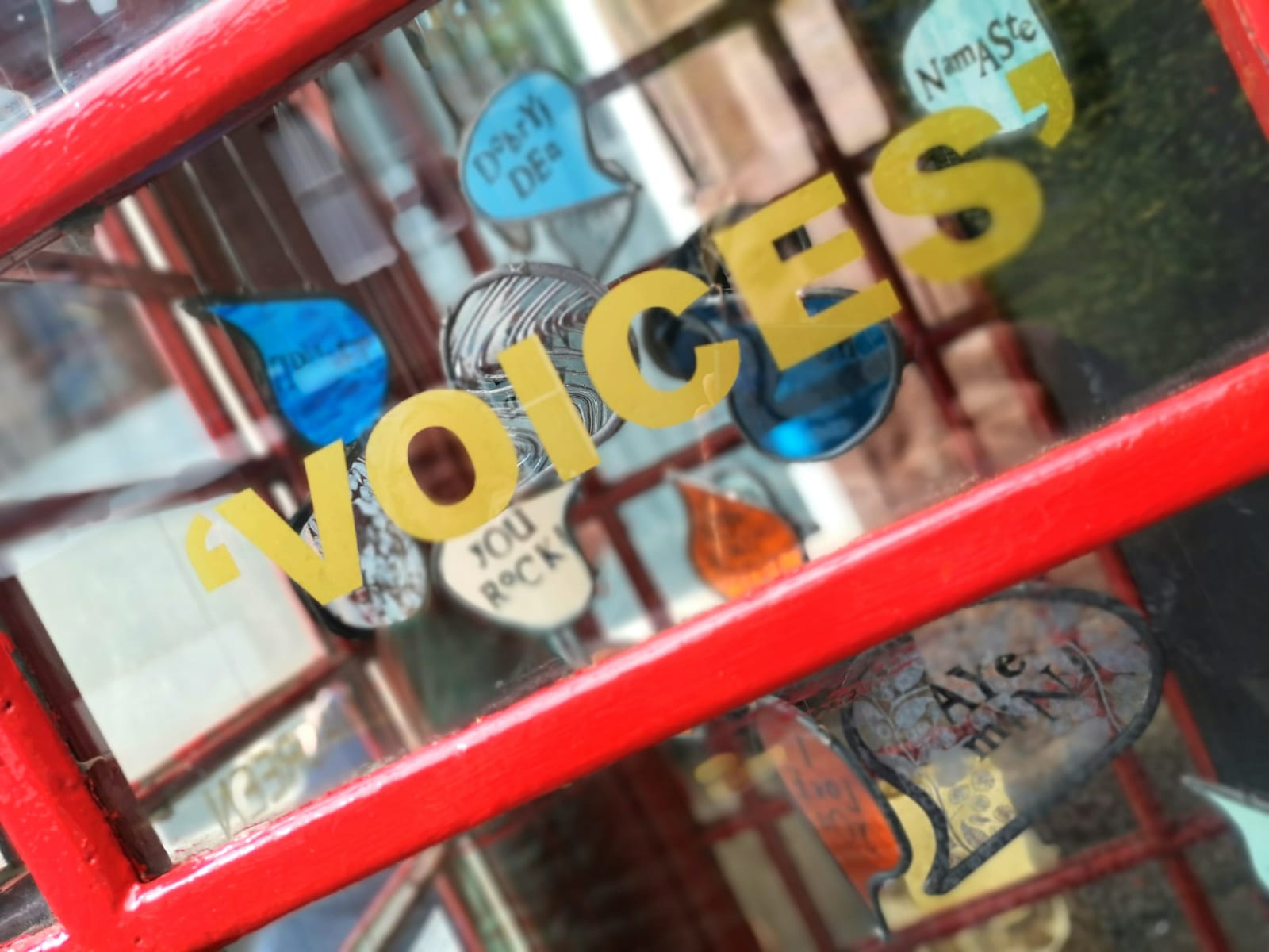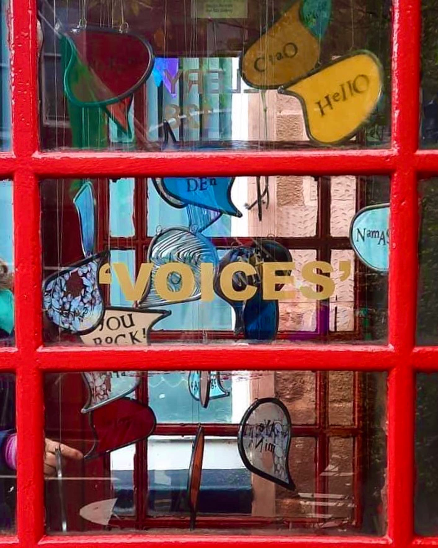 The 128 Telephone Box Gallery had a wonderful launch of Crosbie’s site-specific installation, ‘VOICES’ on Saturday 6th August 2022. As you can see from the photos, Crosbie’s work integrates itself harmoniously within the telephone box. Brightly coloured leaded glass speech bubbles with intricate patterns that carry printed words of salutation, exclamation or colloquialisms shine and sway gently – as they do they reflect and cast playful shadows that change and dance like memories as time passes.