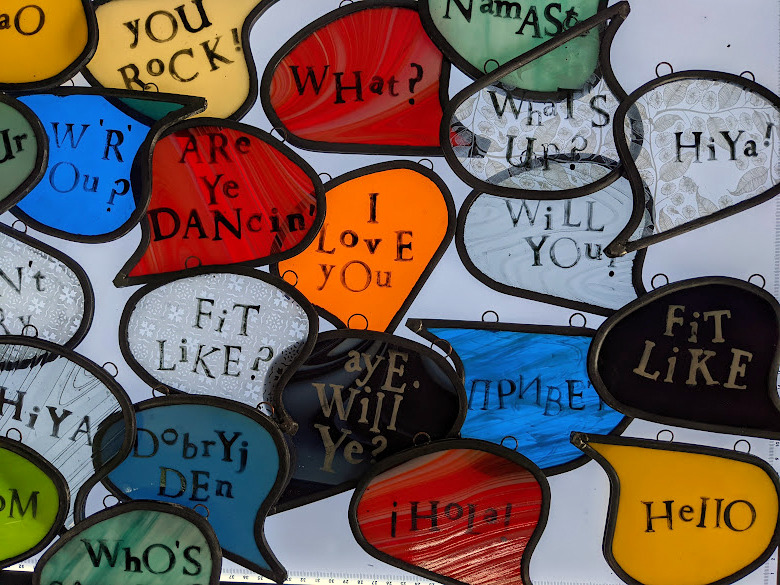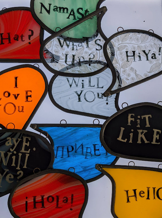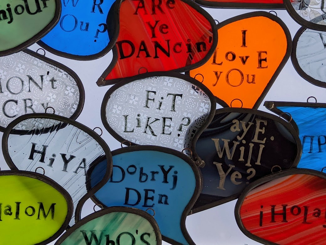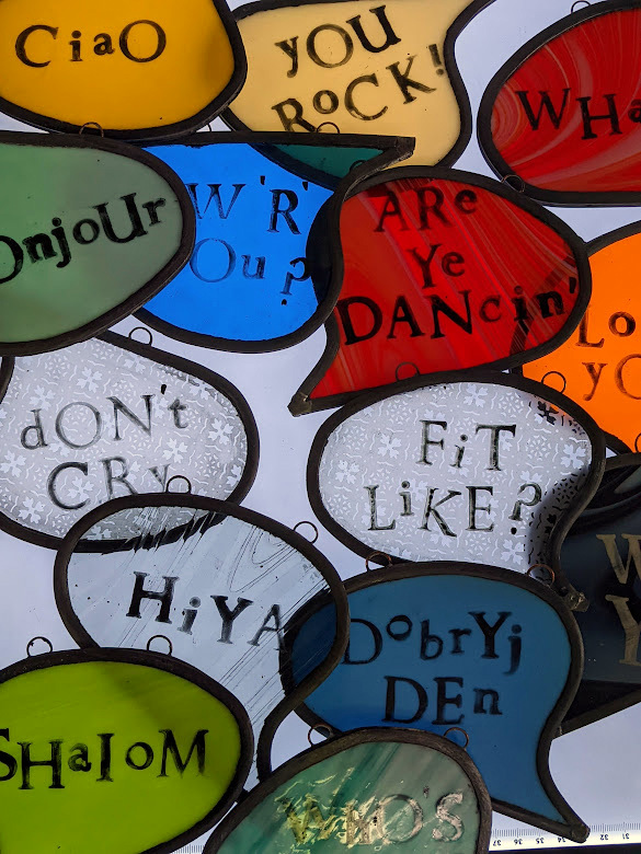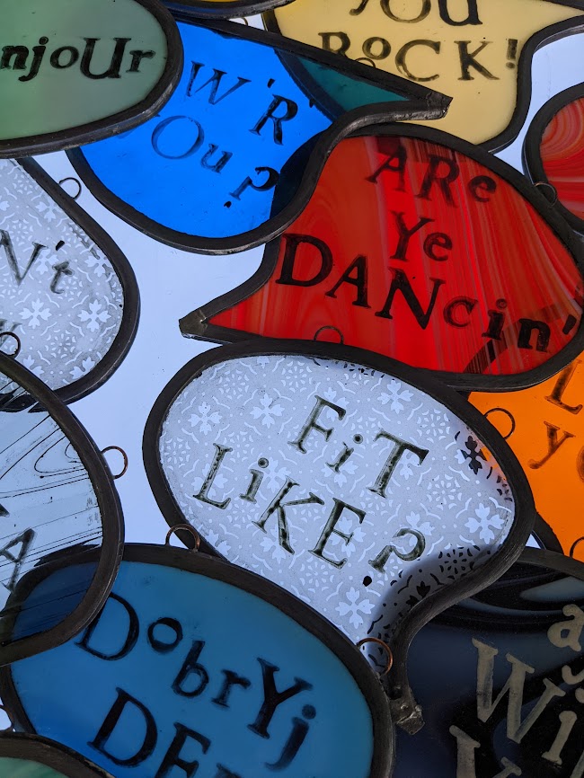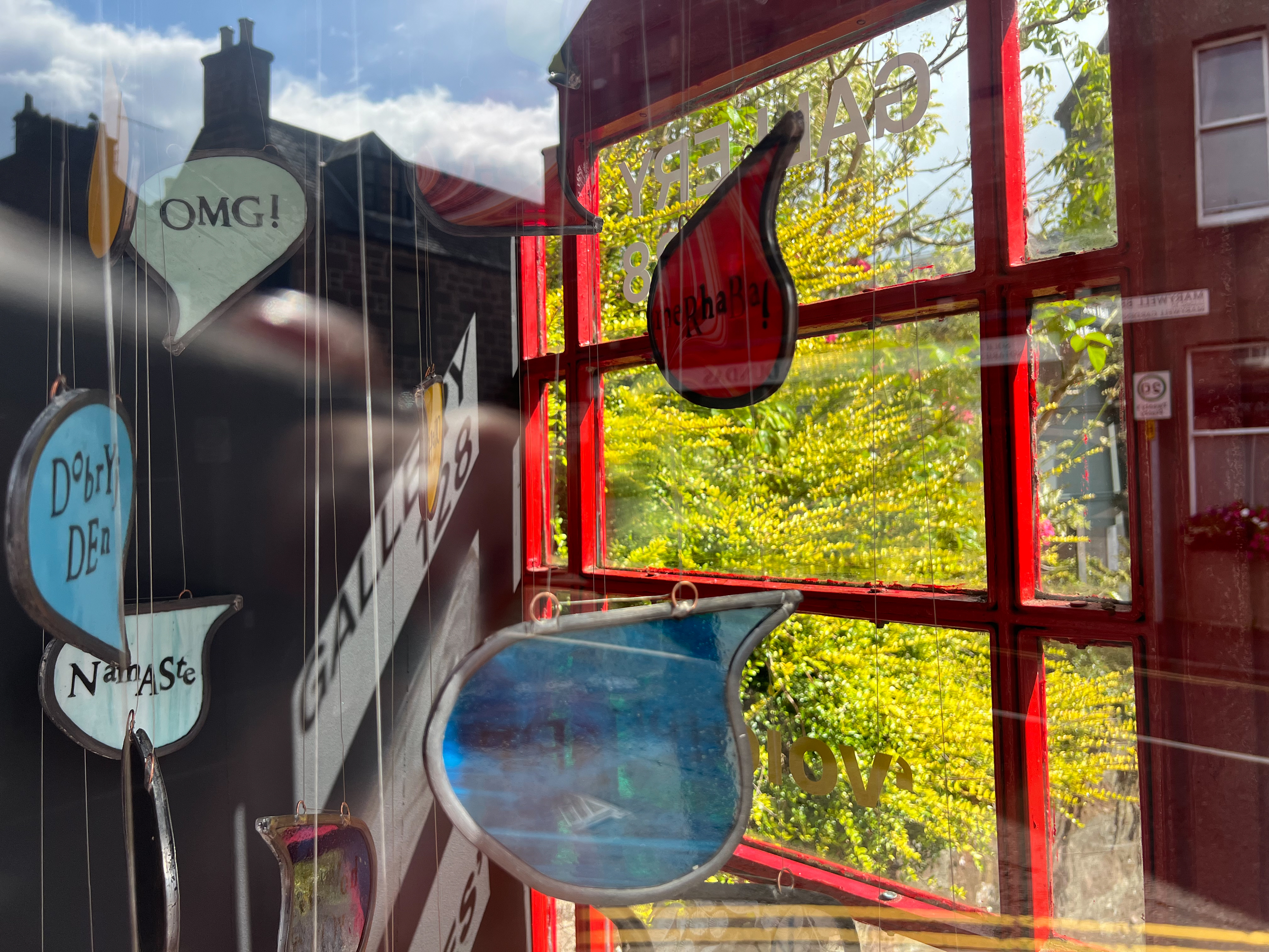 The 128 Telephone Box Gallery had a wonderful launch of Crosbie’s site-specific installation, ‘VOICES’ on Saturday 6th August 2022. As you can see from the photos, Crosbie’s work integrates itself harmoniously within the telephone box. Brightly coloured leaded glass speech bubbles with intricate patterns that carry printed words of salutation, exclamation or colloquialisms shine and sway gently – as they do they reflect and cast playful shadows that change and dance like memories as time passes.