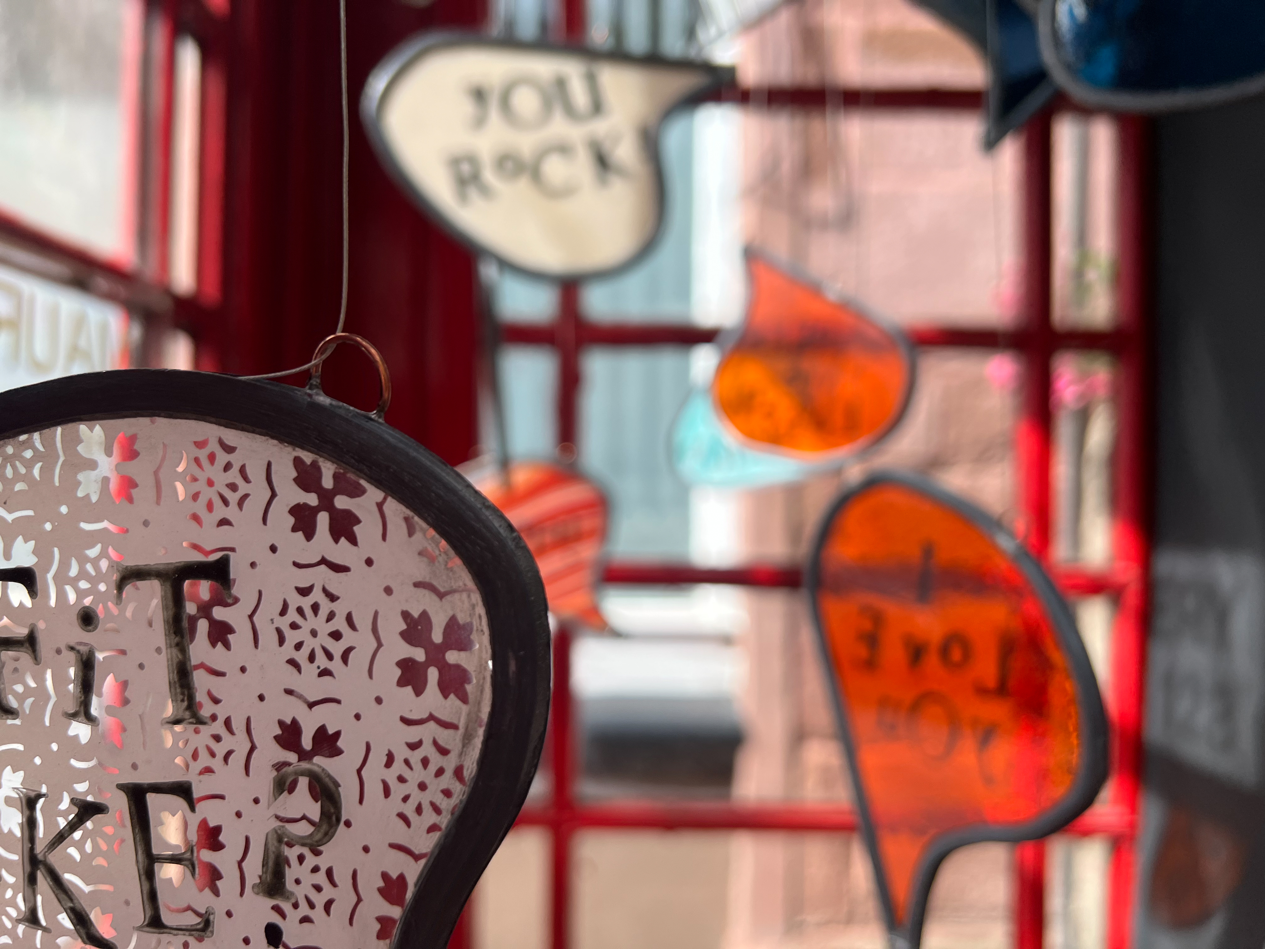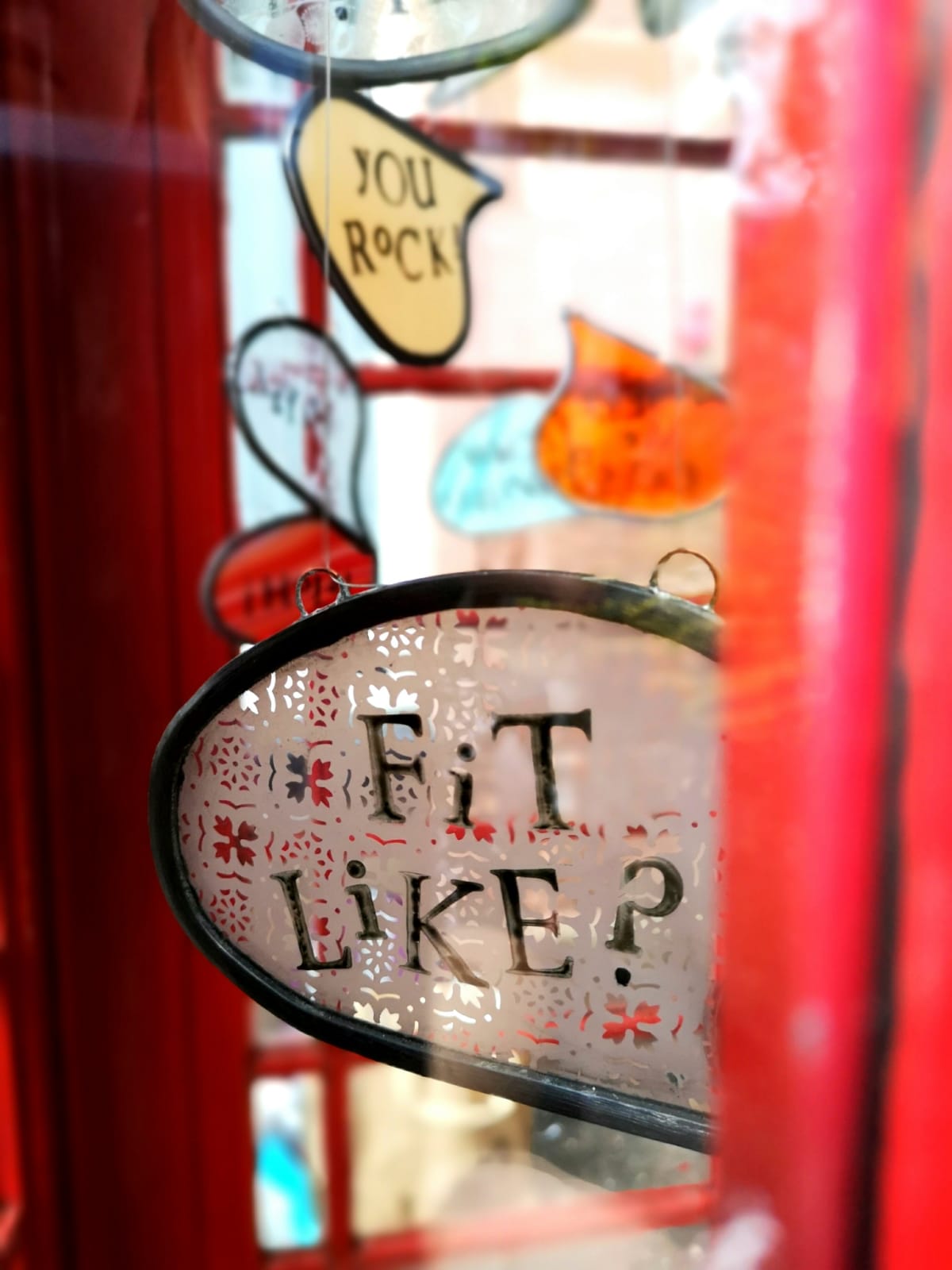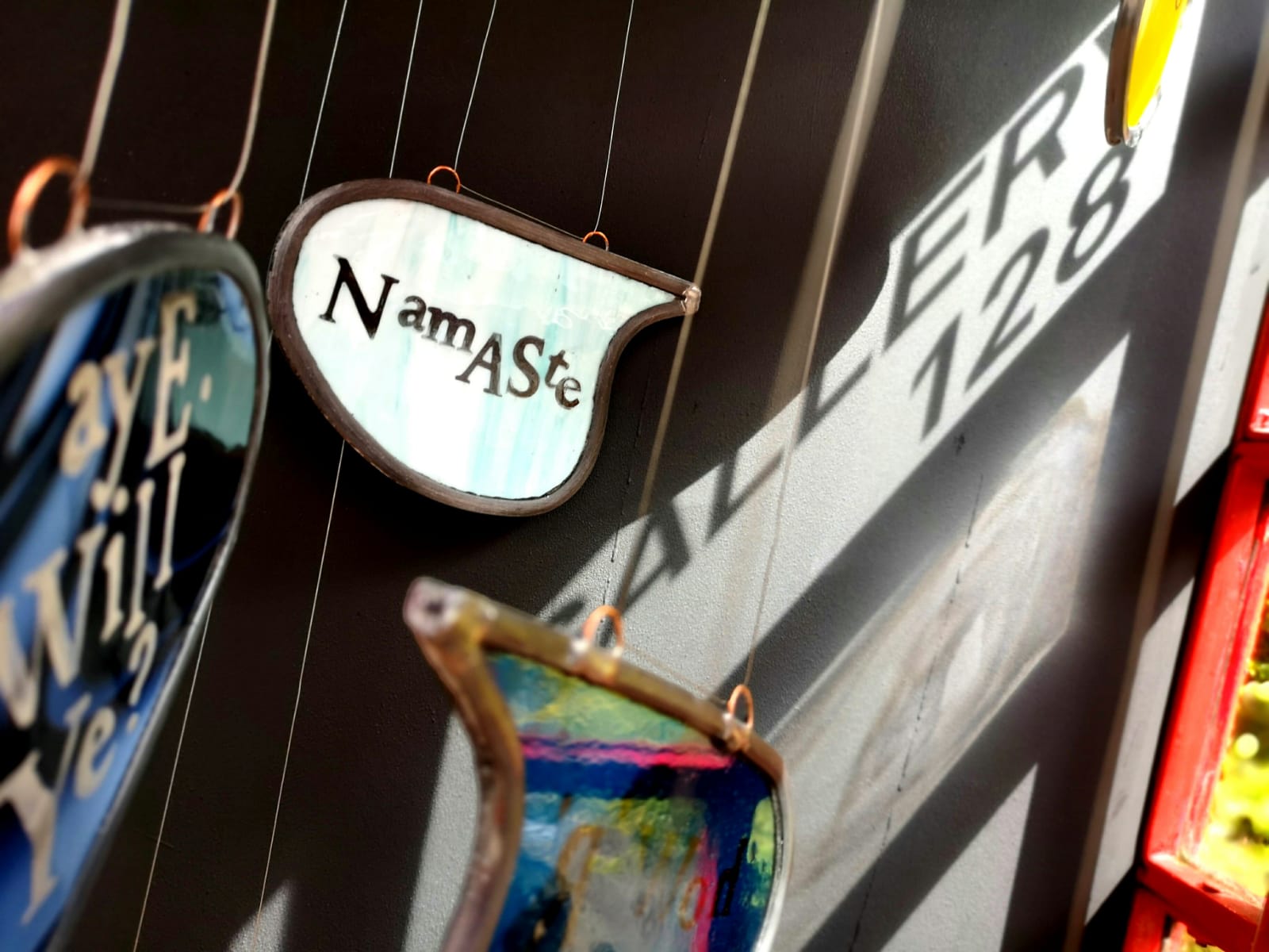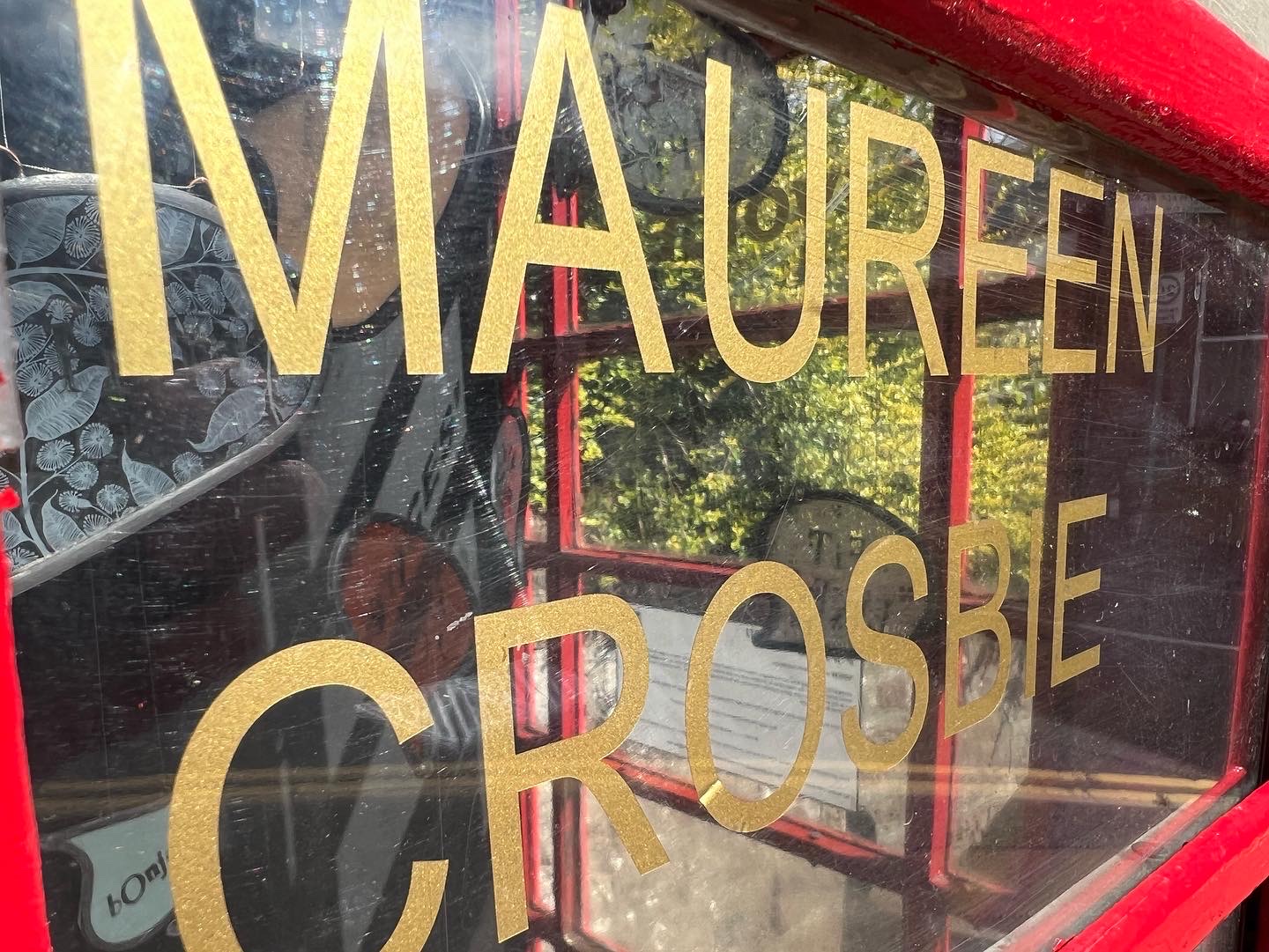 The 128 Telephone Box Gallery had a wonderful launch of Crosbie’s site-specific installation, ‘VOICES’ on Saturday 6th August 2022. As you can see from the photos, Crosbie’s work integrates itself harmoniously within the telephone box. Brightly coloured leaded glass speech bubbles with intricate patterns that carry printed words of salutation, exclamation or colloquialisms shine and sway gently – as they do they reflect and cast playful shadows that change and dance like memories as time passes.