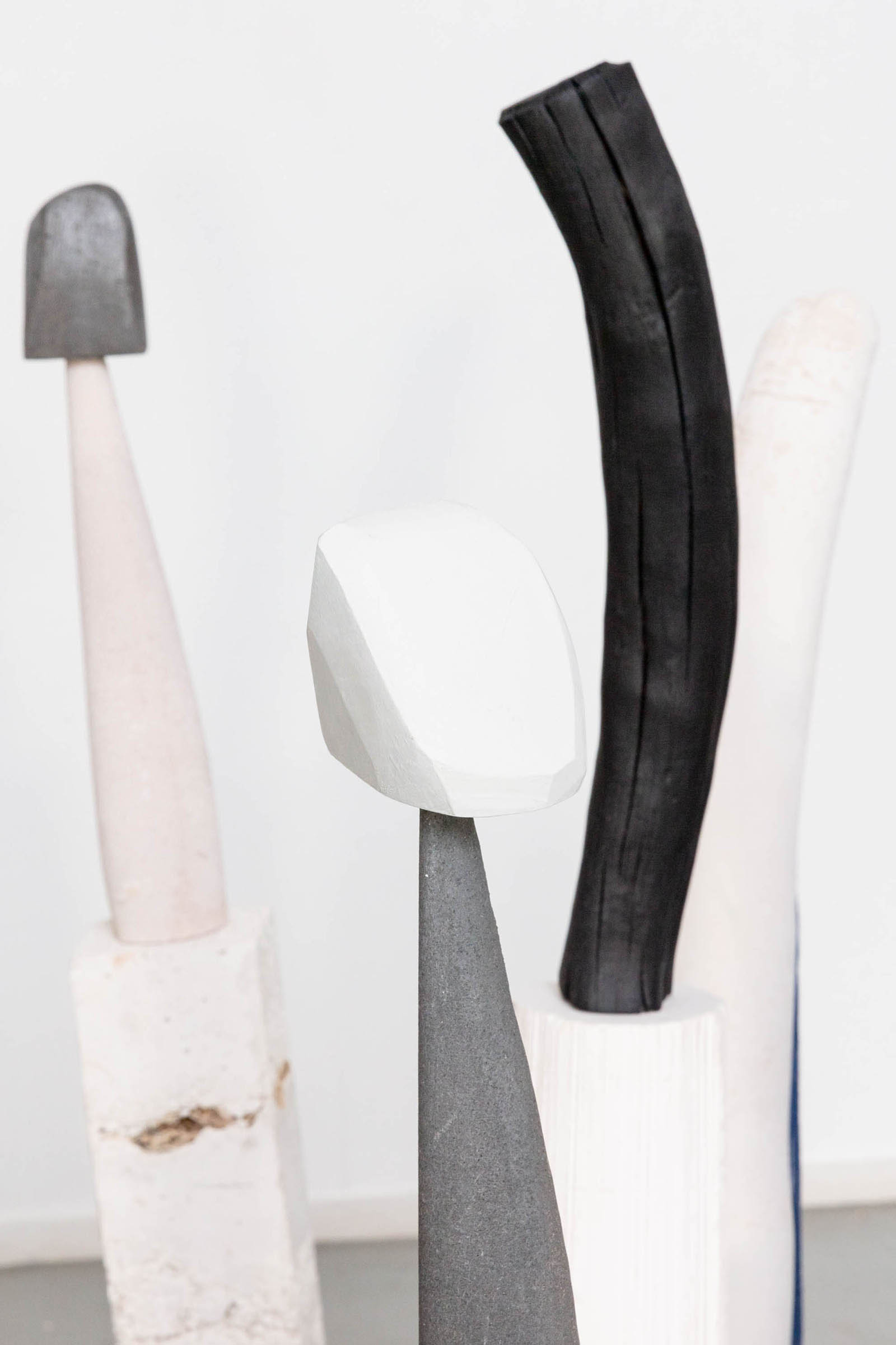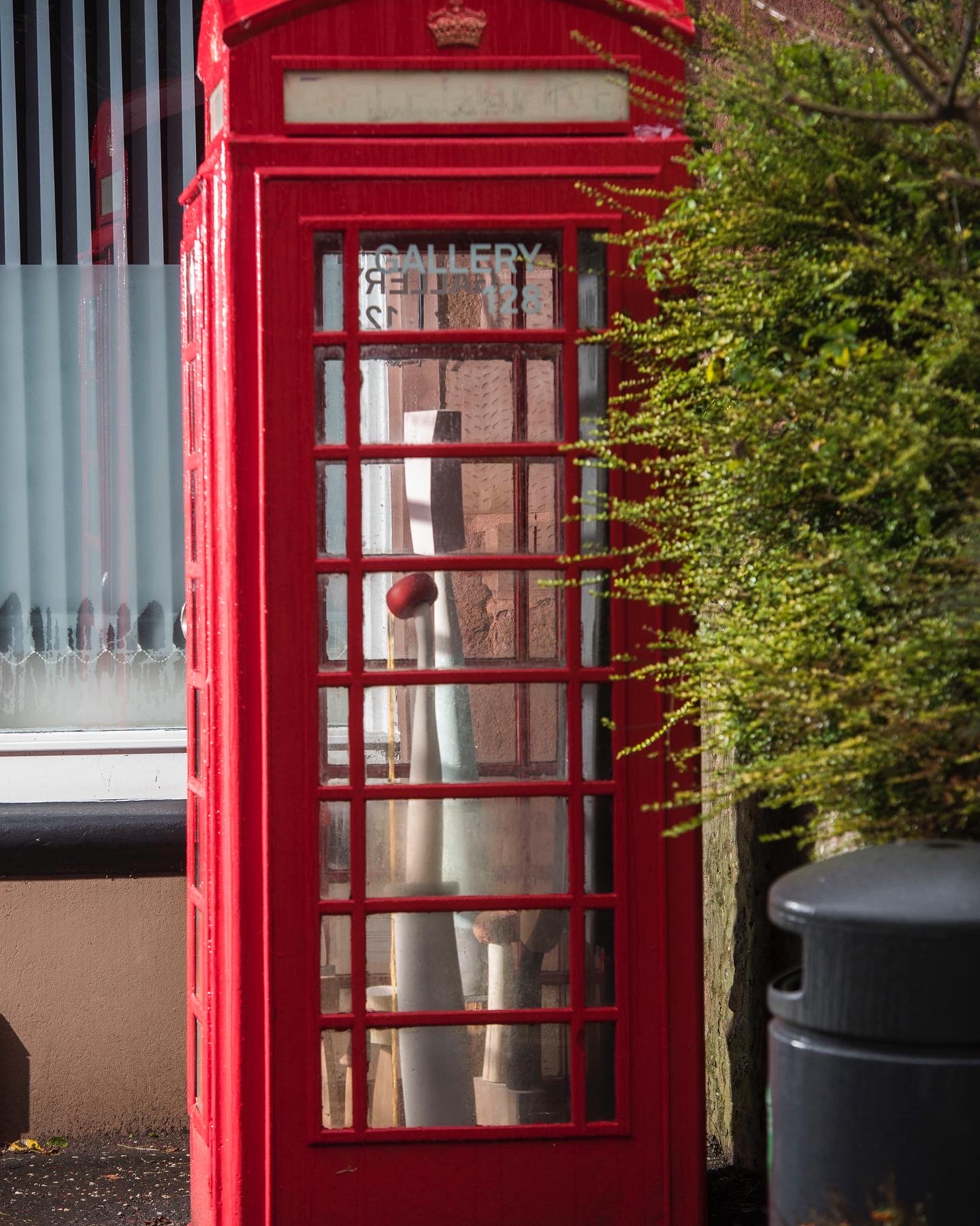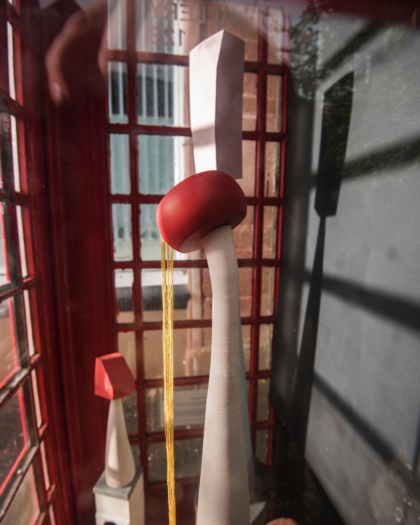 “My works are abstractly figurative forms that try to blur the distinction between entity and object. My interest lies in the symbolic narratives we attach to objects and landscapes, and to our seemingly irresistible impulse to find human form in the structures that surround us. In planning work for the exhibition at the 128 Telephone Box I wanted to switch my attention to focus less on the stories we read and more on the way information is given and received through connected channels of communication.”